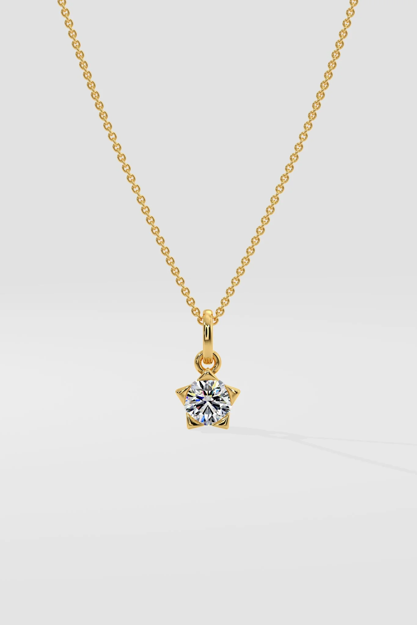 The 0.5 ct Starlight Pendant showcases a dazzling 1/2 ct round diamond set within a gold star-shaped frame. Its design exudes simplicity perfect for everyday wear.