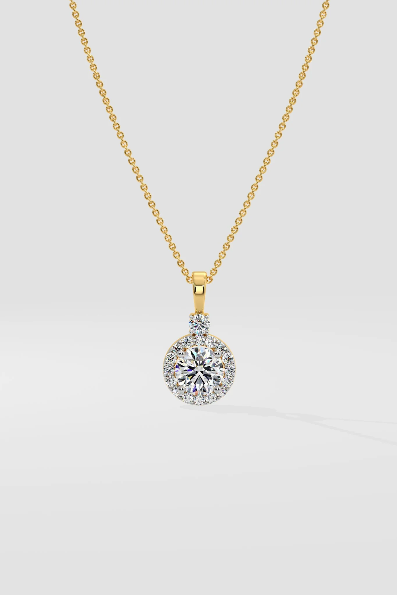 Our 0.75 ct Halo Solitaire Necklace It features a brilliant 0.75 ct round center stone delicately surrounded by a sparkling halo. Ideal for daily wear and gifting to your loved ones.
