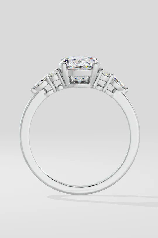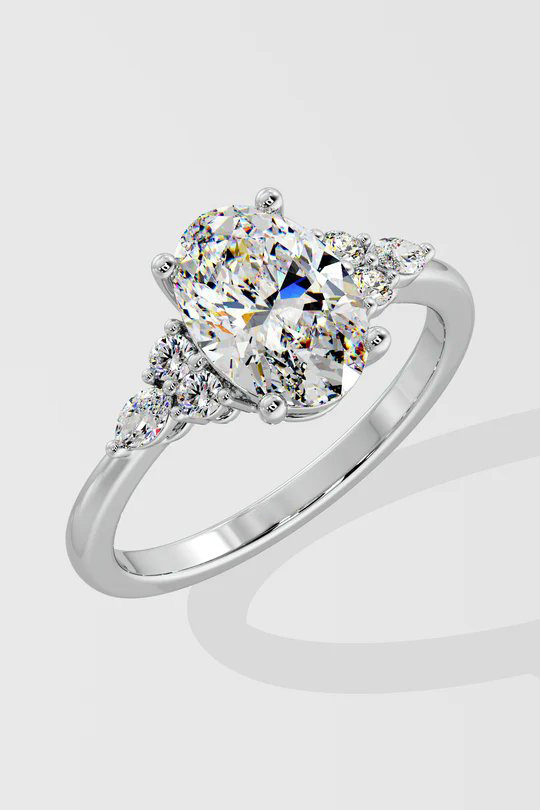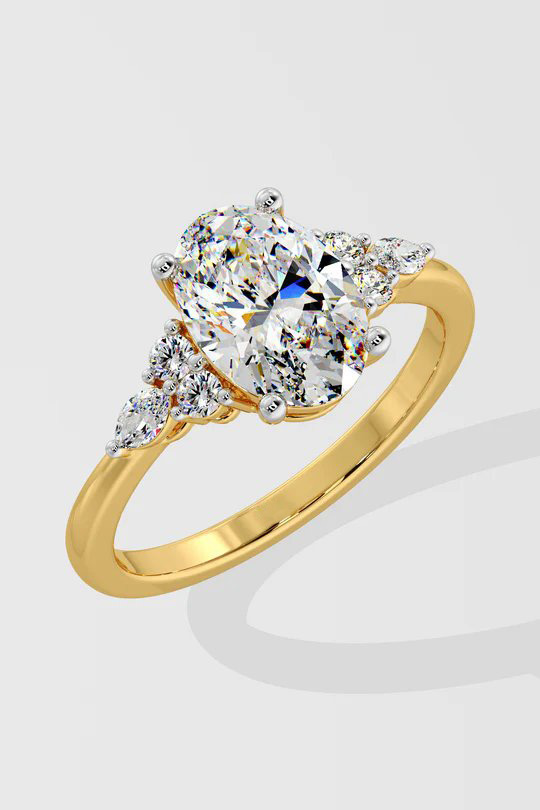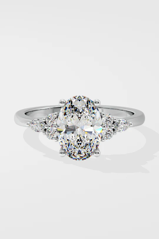 The Opaliea Ring features a 1.5ct oval diamond at its center, accented by delicate side diamonds arranged in a petal design. This nature-inspired ring combines elegance with a touch of whimsy.