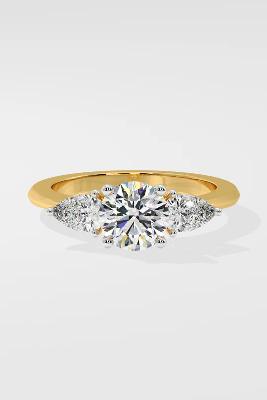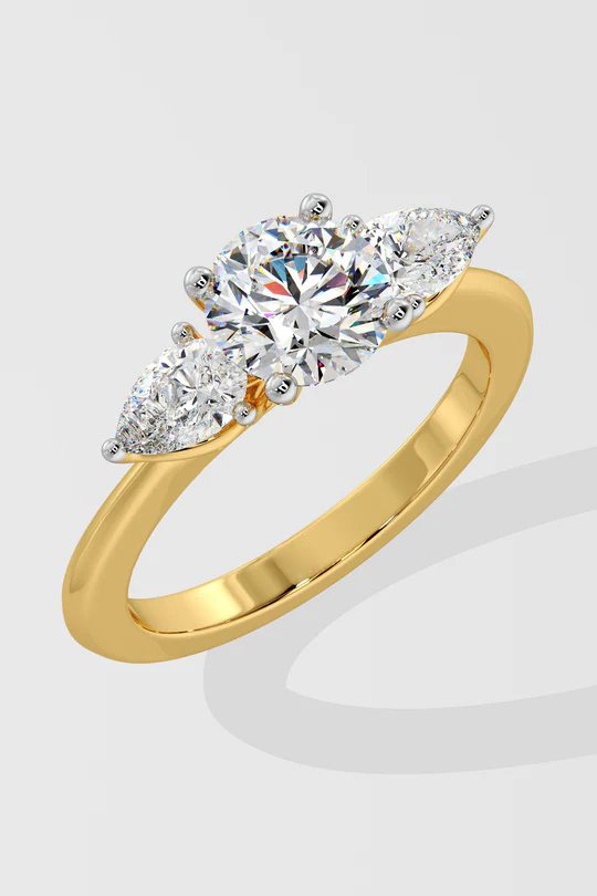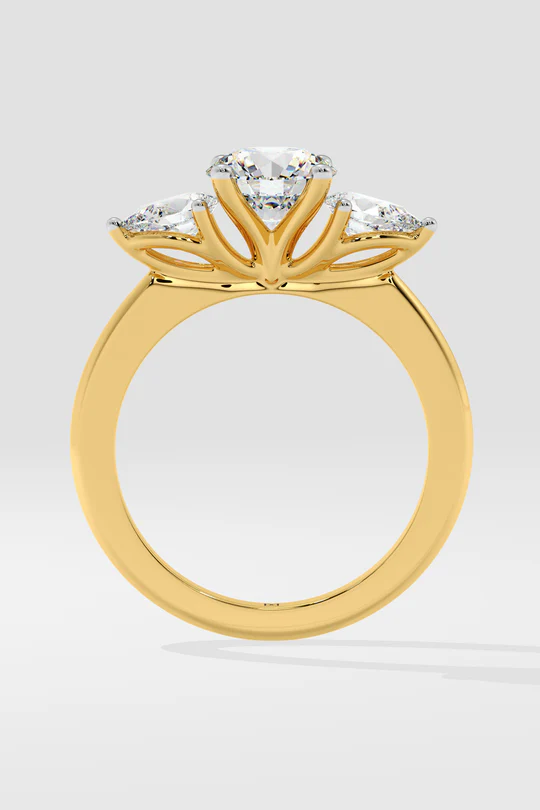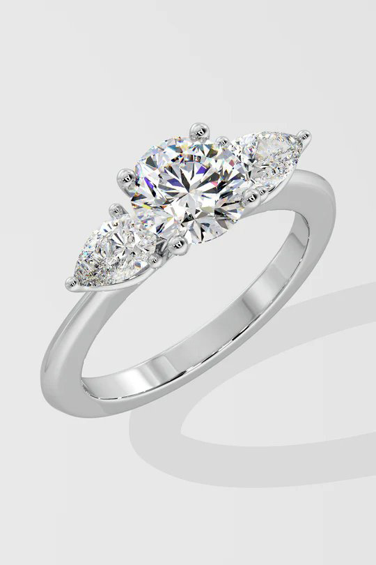 The Opera three stone ring features 1.5 ct solitaire as a center diamond with 0.30 pointer pears on the side. A twist on the classic 3 stone, this one has an edgy modern flair.