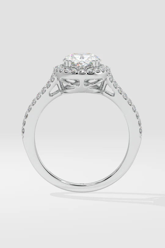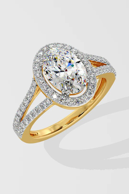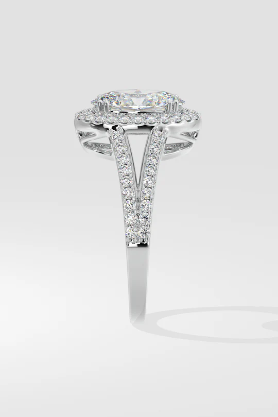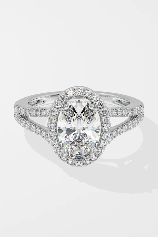 This 1.5 ct Oval Ring features the classic halo, combined with the studded split shank. The Oval will always look bigger than the actual ct wt it is, hence the split shank is interesting for a fuller, chunkier option. Will look great in a yellow gold option as well.