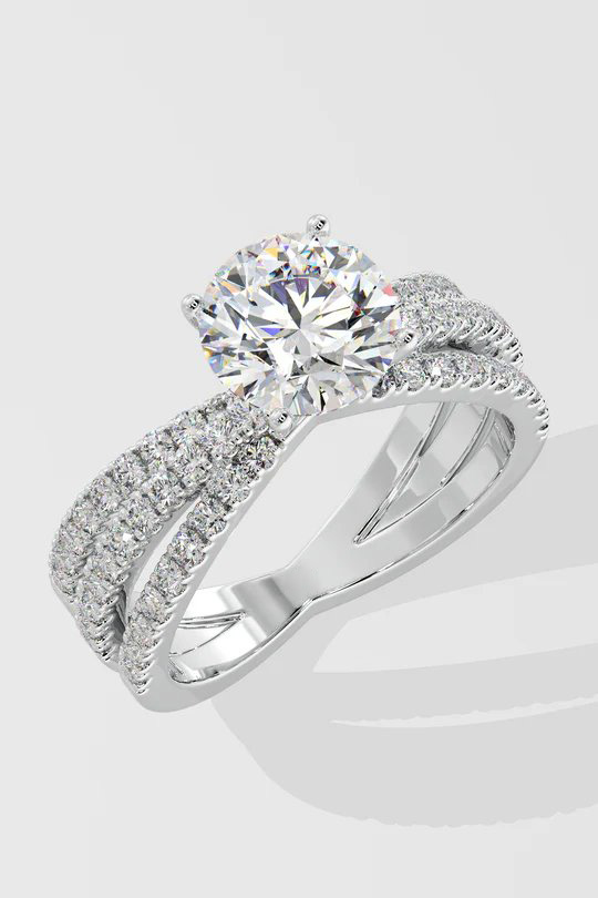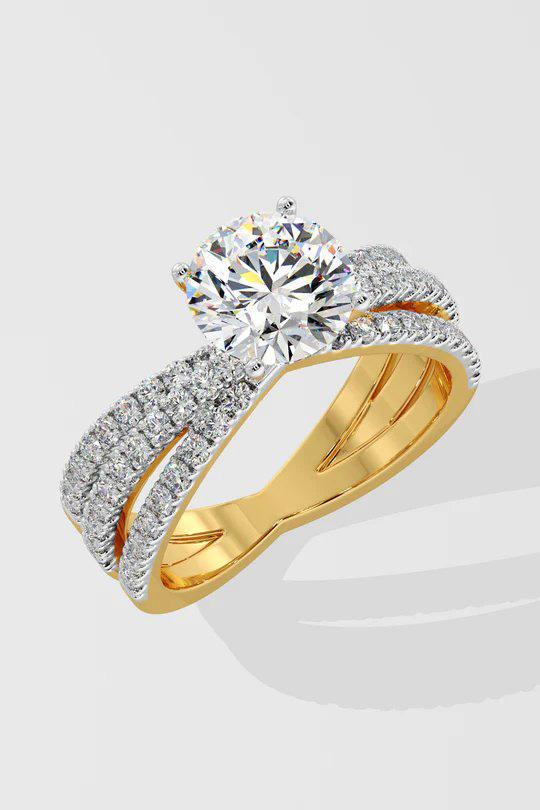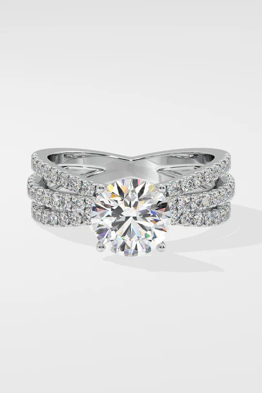The Triple Crossover features a 1.5 ct round center diamond mounted on the dazzling three row studded band. A statement, an unmissable bling thing and a novel edgy diamond ring : go bold and beyond with all three.