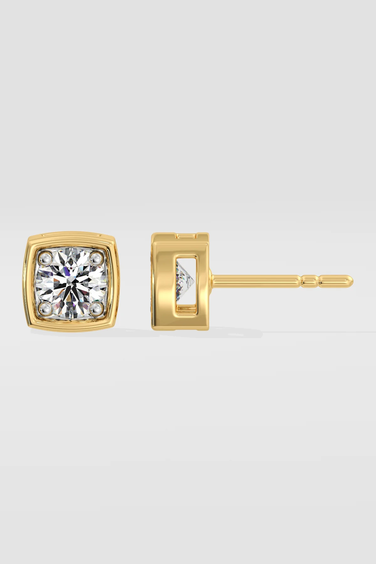 The classic Bezel Cushion studs are 1/2 ct each (total tag wt. 1 ct) everyday essentials. A slight twist from the classic round, the round brilliants are set in cushion-shaped bezels to give it that contemporary chic style. Perfect for gifting as well.