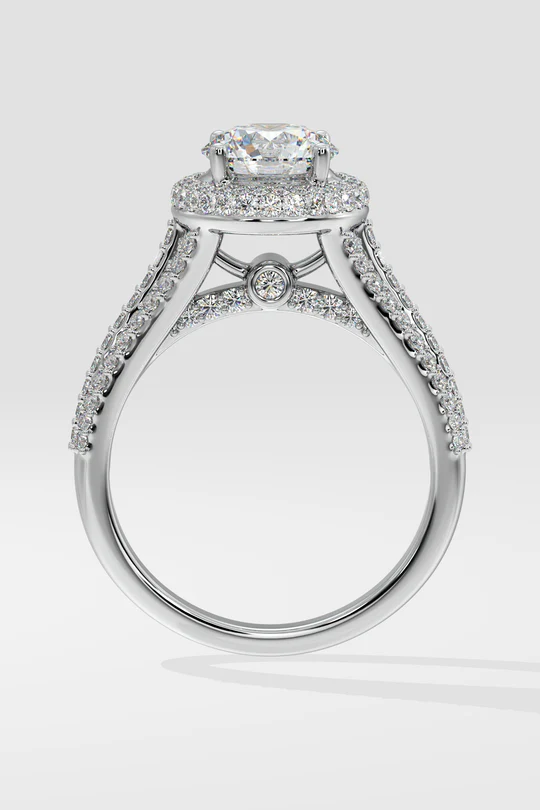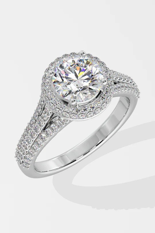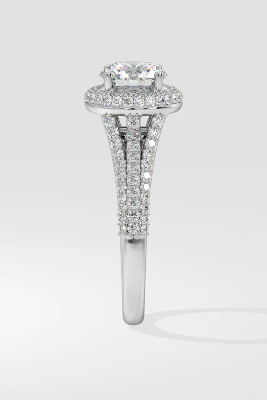 The Crossover Solitaire features a 1ct center with a stunning diamond encrusted halo. Completely studded with smaller diamonds this soltaire ring is a masterful piece of workmanship.