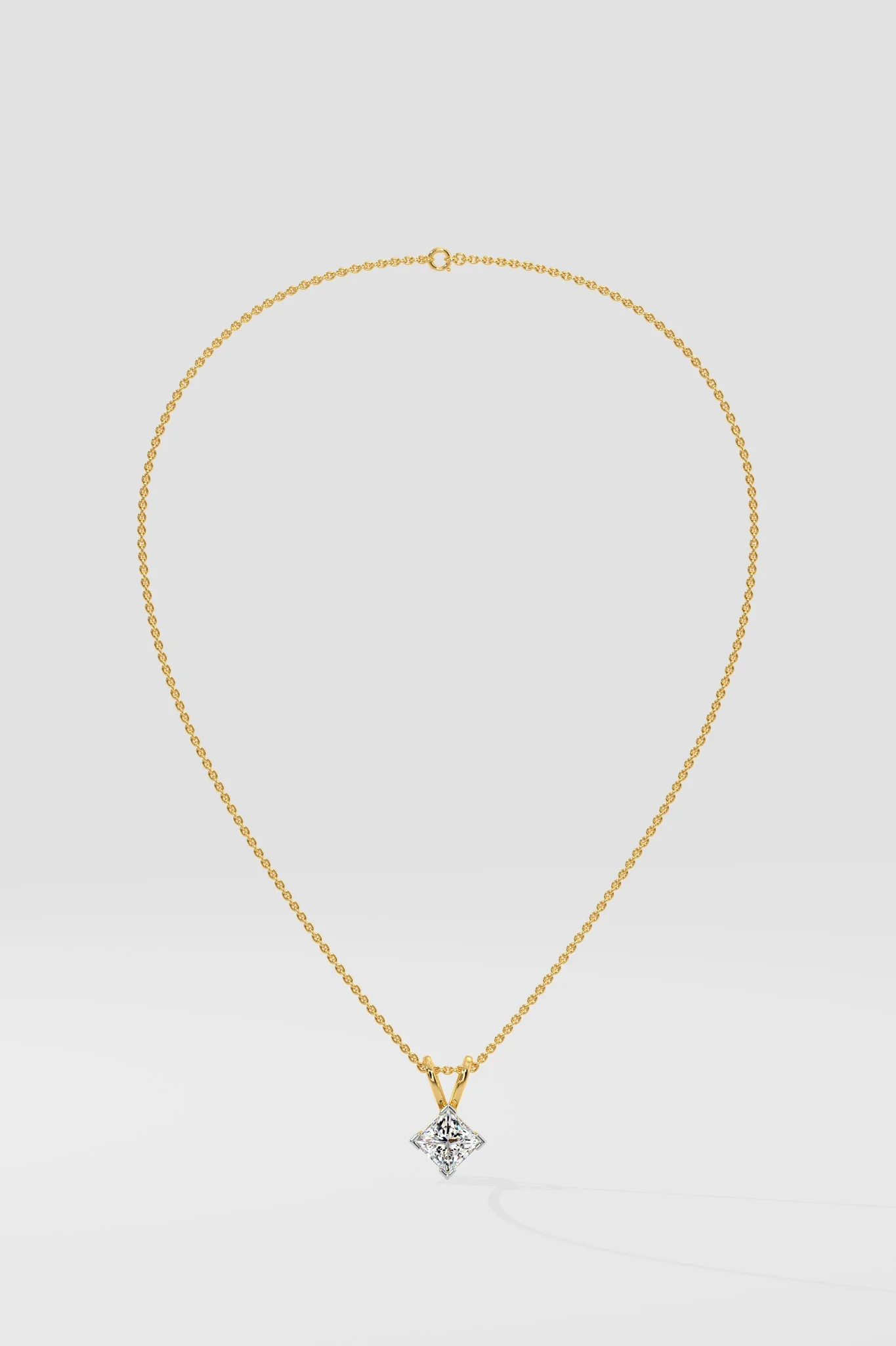 1 ct Angular Pendant works wonderfully with the edgy princess cut. A V shaped loop design adds that the clean line angle. It allows the perfect square diamond to come alive. A daily style to add to your existing gold chain.