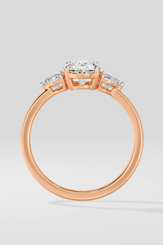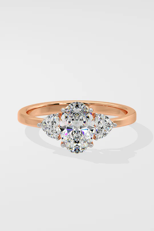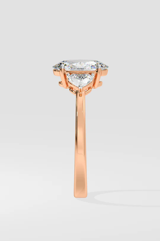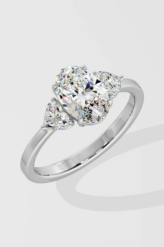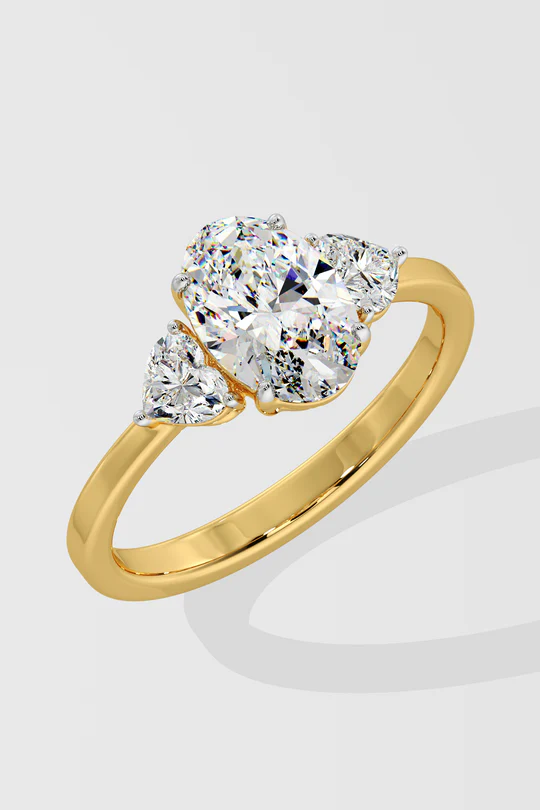 The Trillium Oval ring features a 1 carat centre, elegantly flanked by two beautiful heart diamonds. A contemporary extension of the classic 3 stone ring, with a sleek gold band. The 3 stone series signifies the past, present and future.