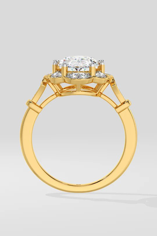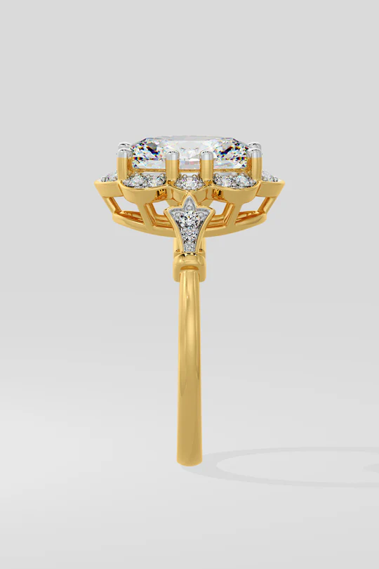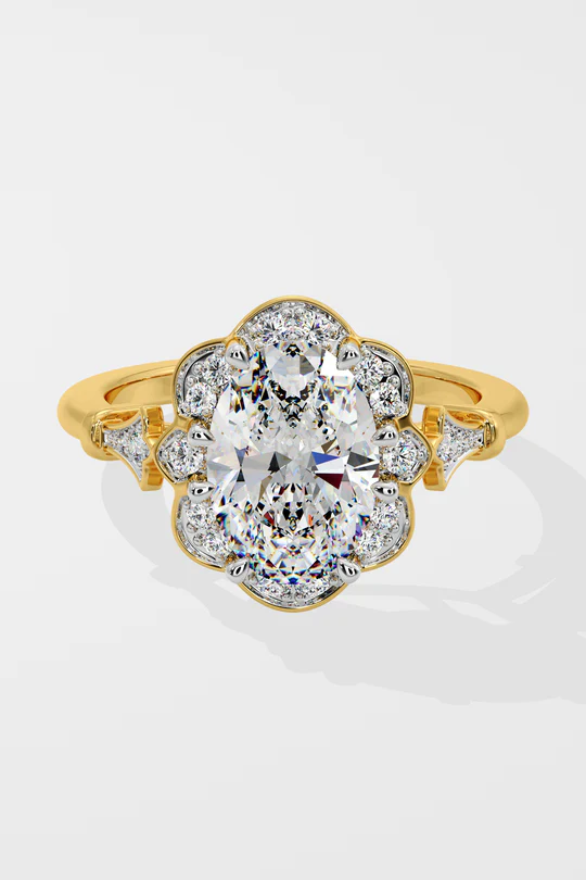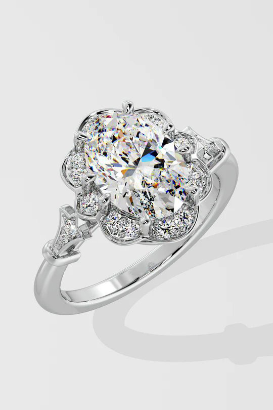 The 2.5ct Rendezvous Ring is a masterpiece featuring a brilliant 2.5ct oval diamond, elegantly framed by a floral cluster of shimmering diamonds. Set on a band, its intricate design gives feeling of luxury.