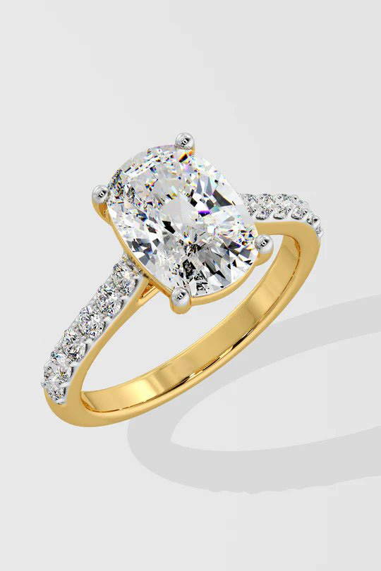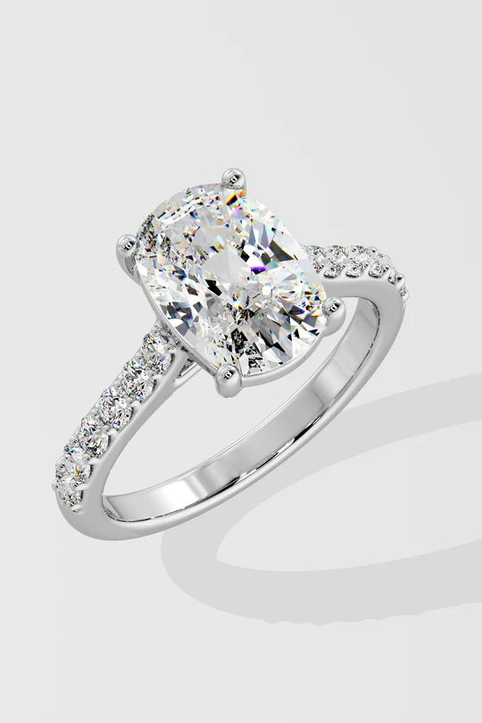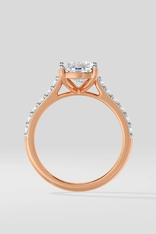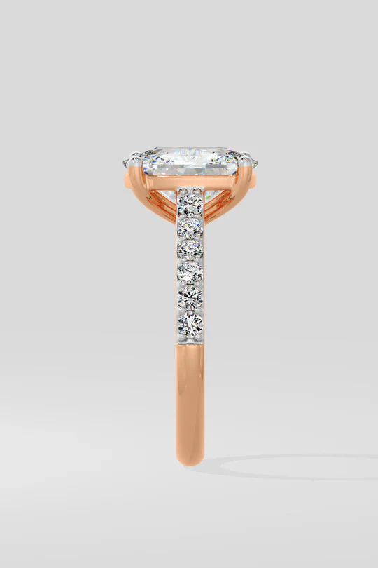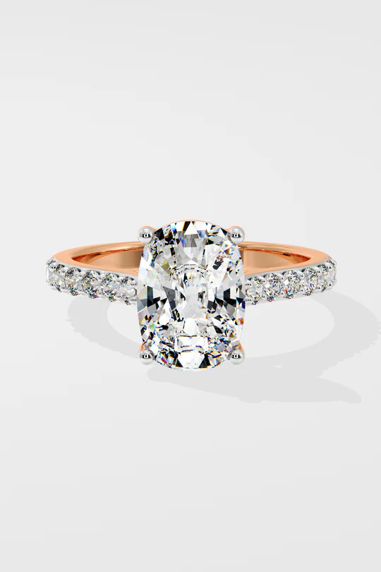 The 2 ct Cushion Classic Ring features a captivating 2 ct cushion-cut diamond at its centre with the classic diamond studded shank. The elongated cushion is a beautiful shape, modern and tasteful.