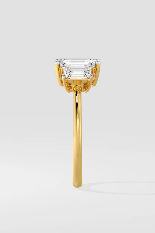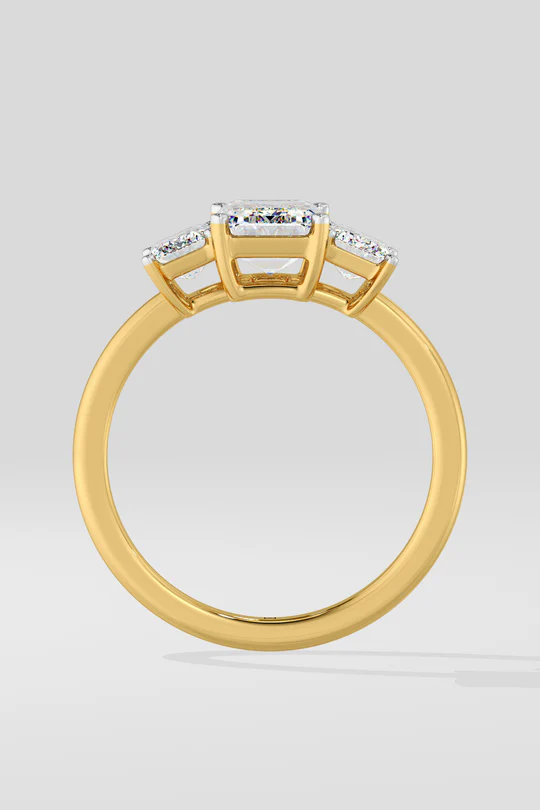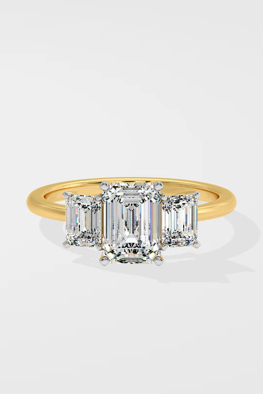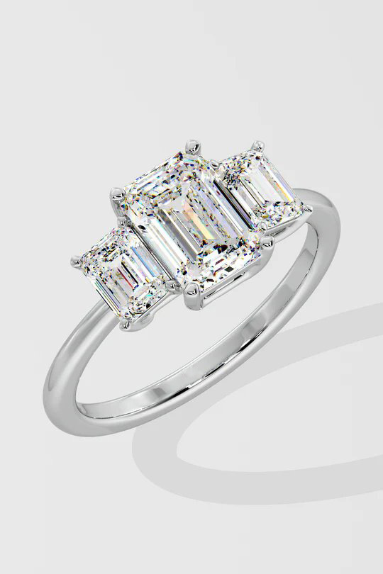 The Emra Trinity Ring features a 2 ct cetnre with sides of with stunning emeralds at 0.30 ct on each side. The 3 stone is always a classic and works wonderfully as an anniversary ring as well.