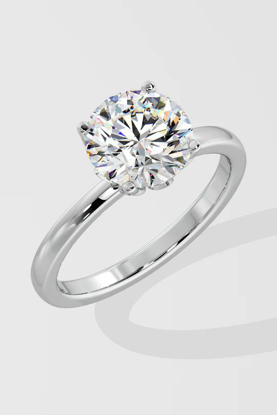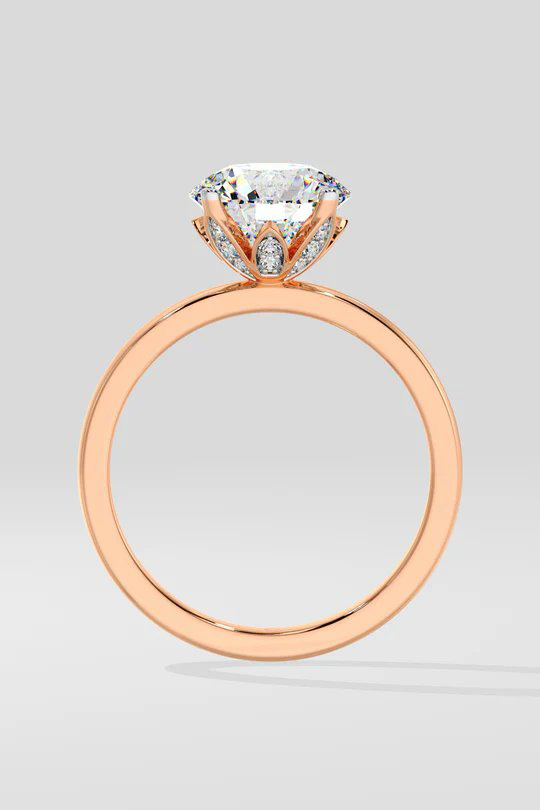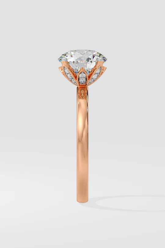 The 2 ct Foliage Ring is classic from the top but intricate below. The center round brilliant is delicately held by a studded petal-inspired crown. Each prong is adorned with diamond accents, that elegantly cradle the solitaire. A modern classic with that distinctive detail.