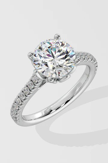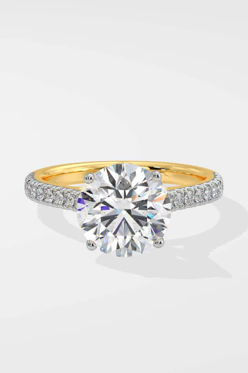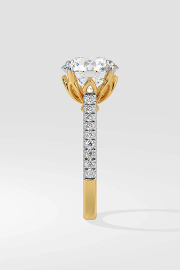 The Lotus Solitaire Ring brings to light a shimmering 2 ct Round brilliant, set in 4 prongs over a beautiful lotus shaped basket mount. Side diamonds encrusted on the shank accentuate the center solitaire. Add an optional gold diamond band to complete the look to make it a stack worthy of everyday.