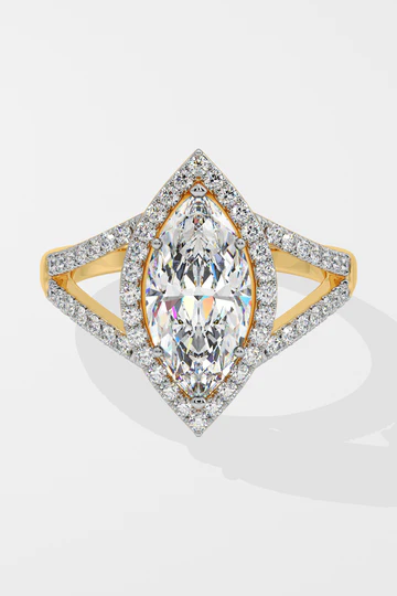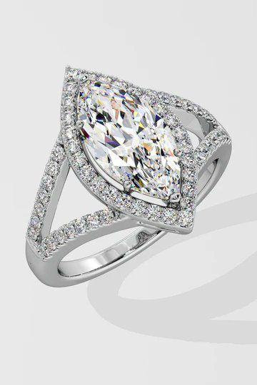 The Marquise Halo Ring features a stunning 2 ct center enveloped with the classical halo. The Split Y studded shank adds to expanse of this ring. Marquise is a special diamond as it spreads much bigger than the ct wt it offers. Modern, edgy and intrepid, this one is not for the minimalist. .