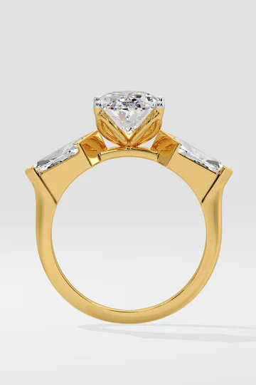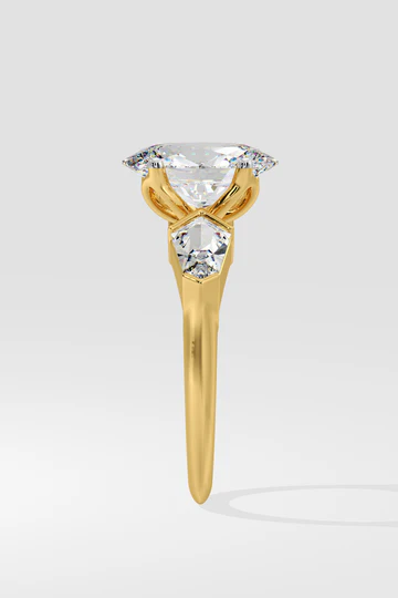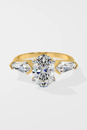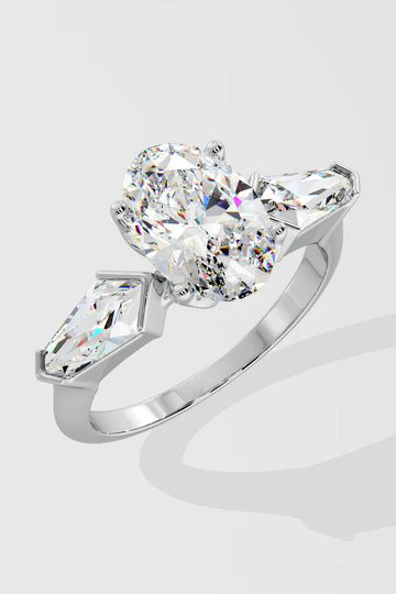 This 2 Ct Oval Solitaire Ring is distinctive because of the special kite-shaped diamonds on the side. The Kite is a unique shape because of its tapered silhouette. Here 1/3 sized kites flank the center 2 ct oval for a glamorous, edgy, and out of the box look.