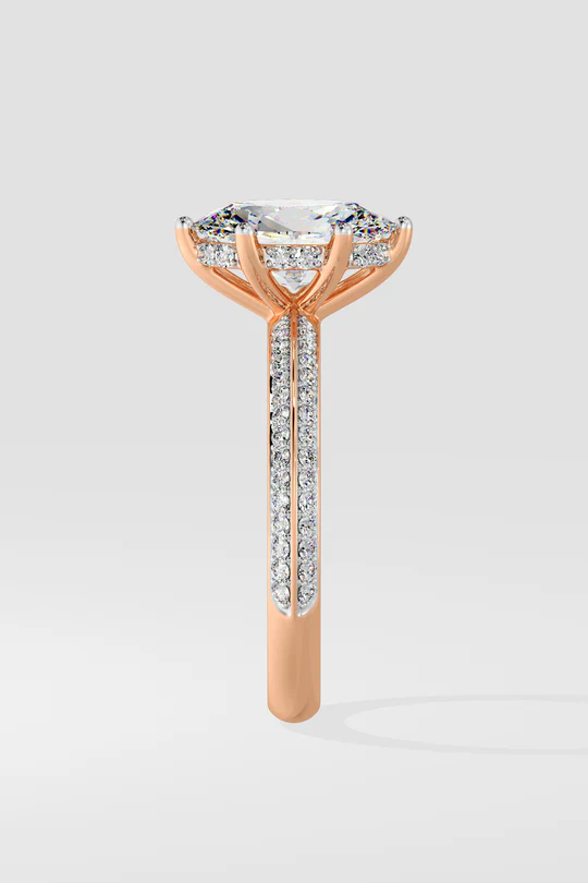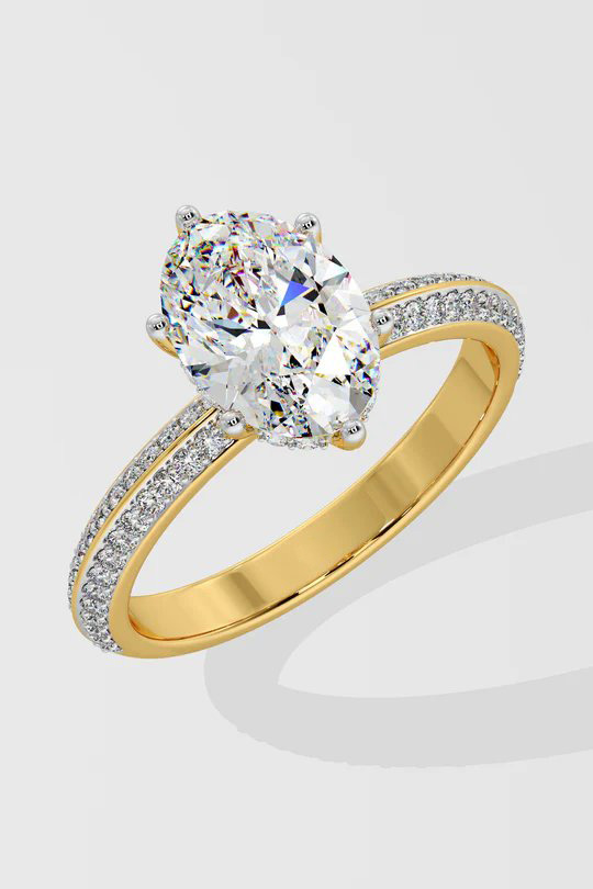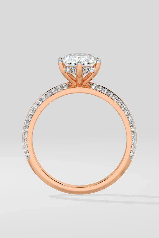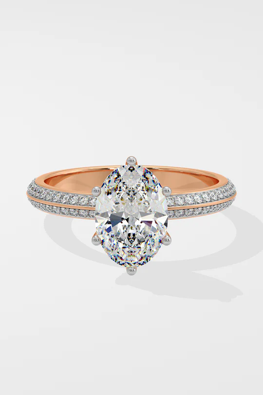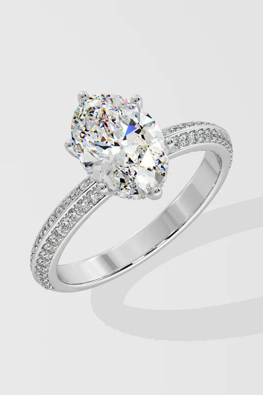 The Oval Ritz Ring features a 2 ct center oval set beautifully with a 6 prong setting. The striking feature of this ring the double knife edge band studded with small round brilliants. A melange of sophistication and modern elegance, this is one of our personal favourites.