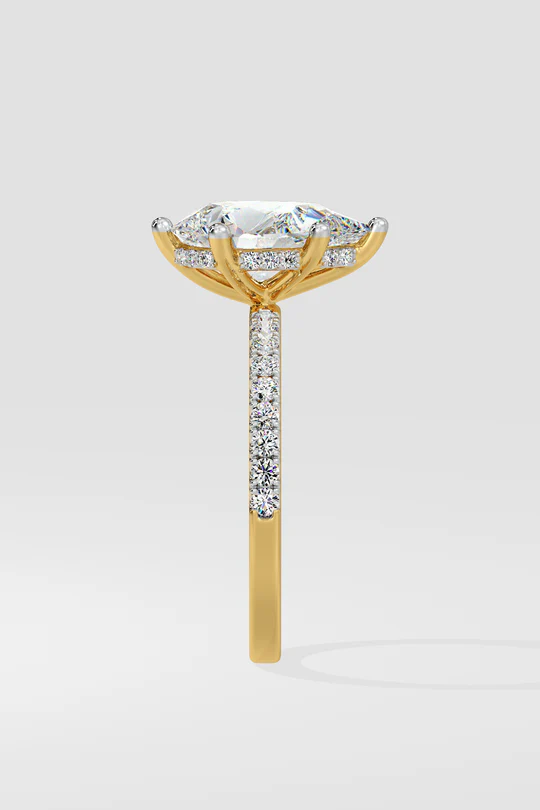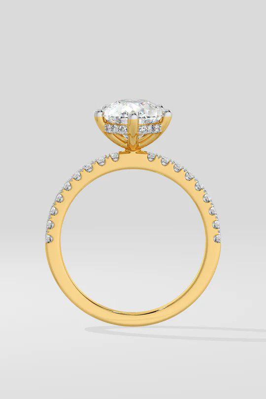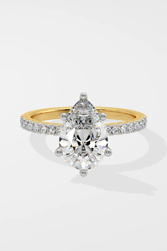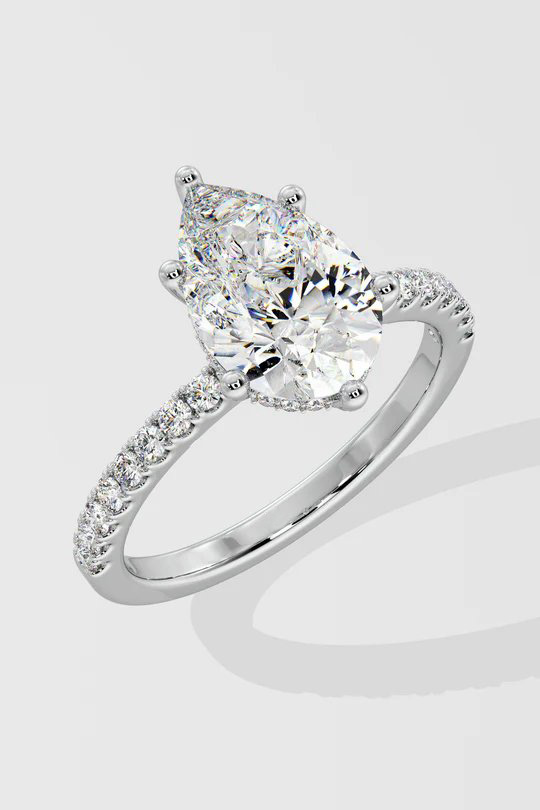 This ring features a 2-carat pear-shaped diamond with a beautiful hidden halo. The studded band completes the all diamond look. A contemporary favourite design for the pear shaped diamond.