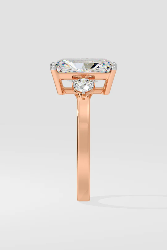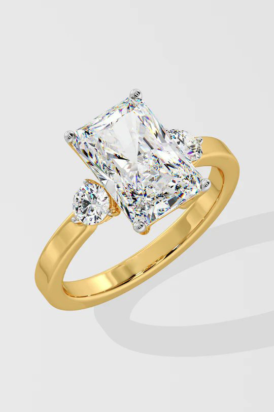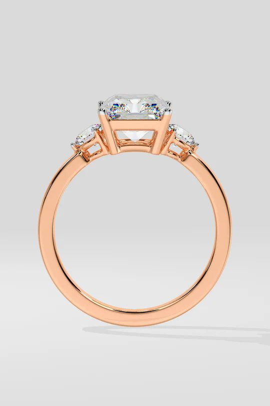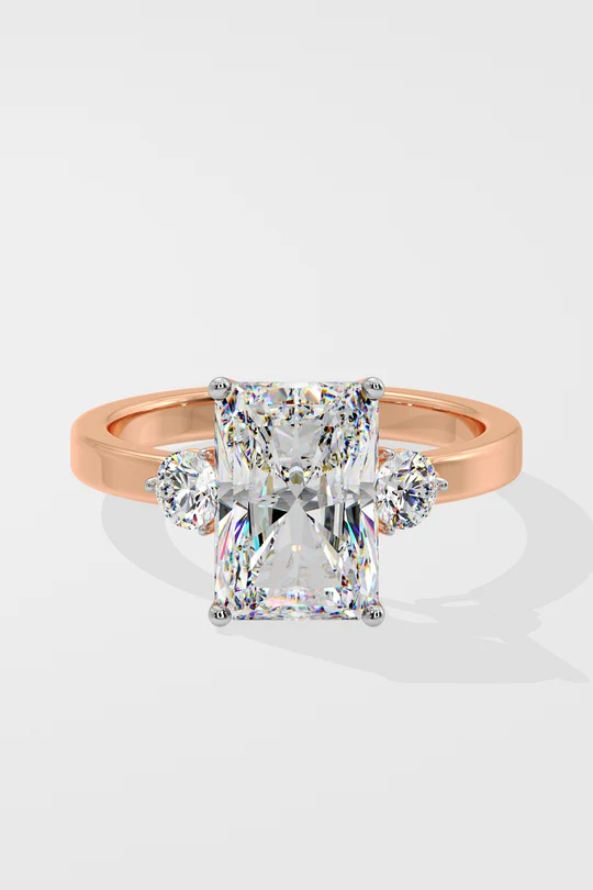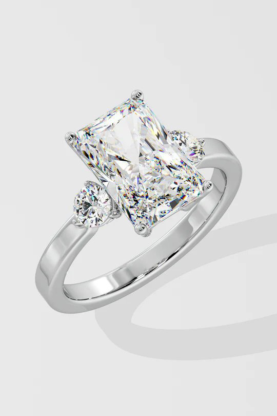 2ct Radiant Accent Ring, featuring a stunning 2ct radiant-cut diamond at its centre and accented by delicate 0.15 ct round diamonds on the sides. A bold rectangle diamond beautifully compliments the round sides.