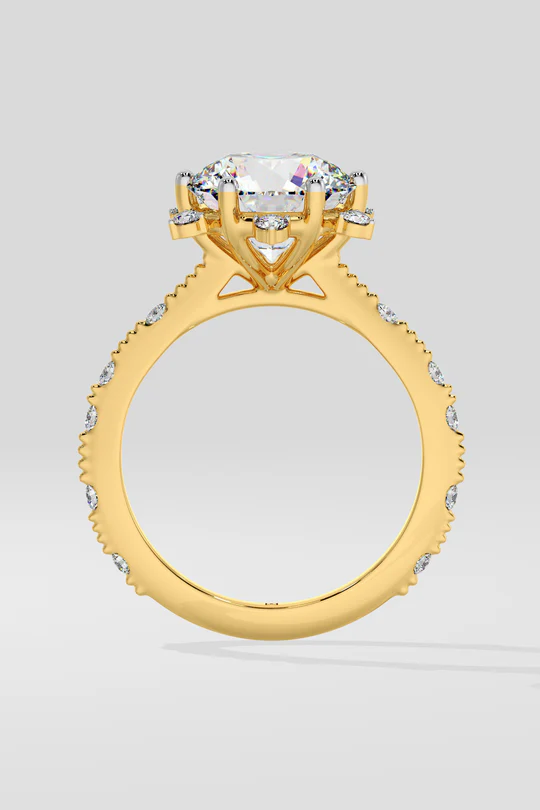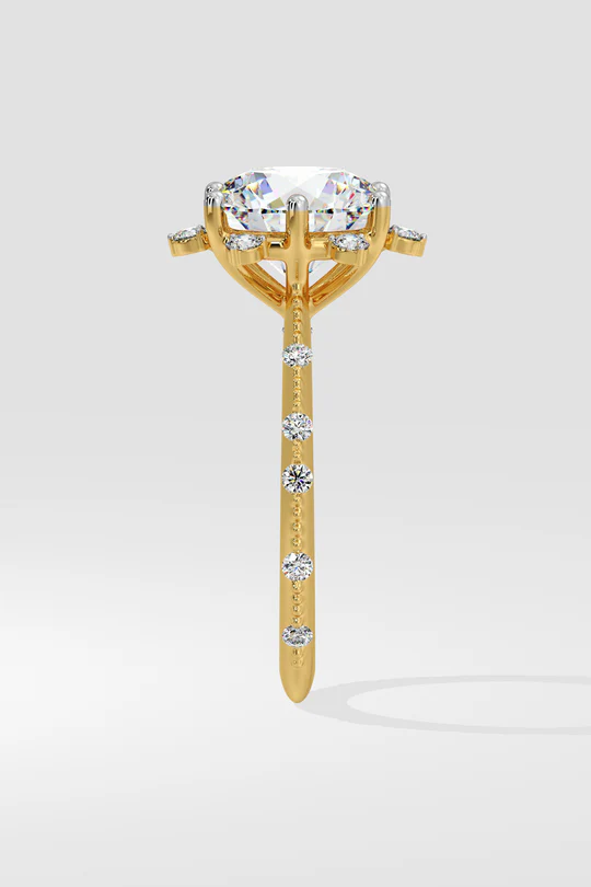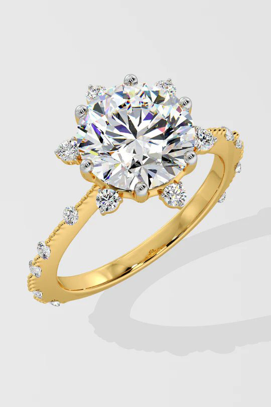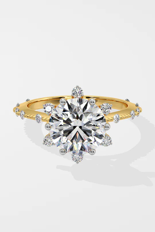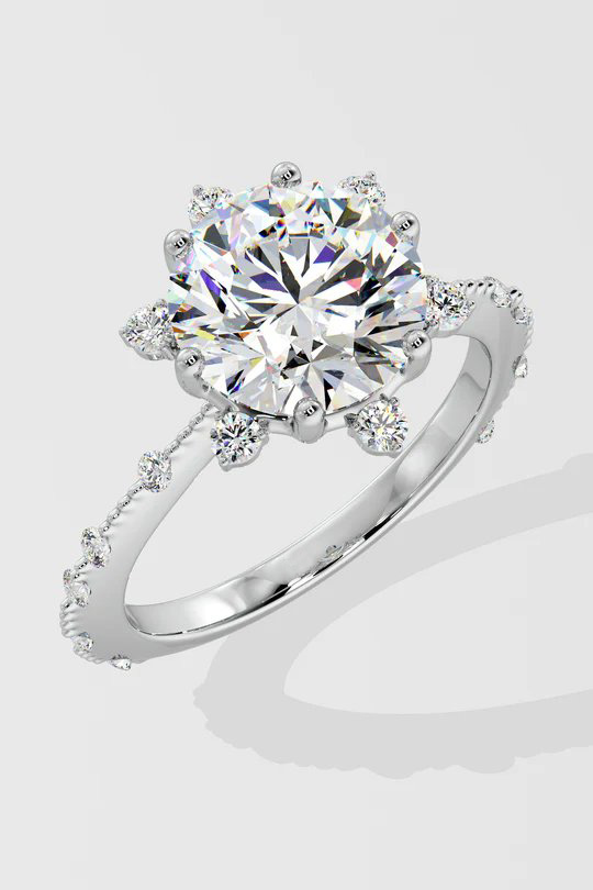 A dazzling 2 ct Starlight Solitaire Ring, featuring a radiant round center diamond that is embraced by a star-like design at every angle. Delicate diamonds adorning the shank add a touch of uniqueness.
