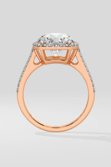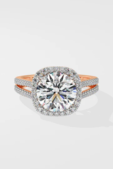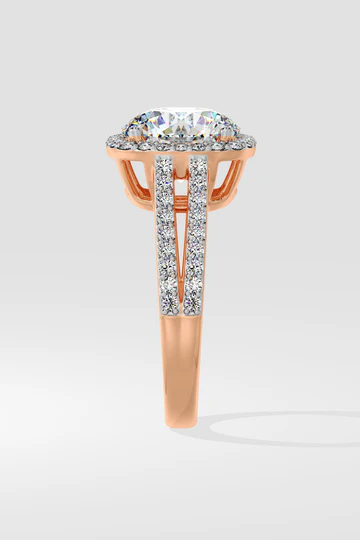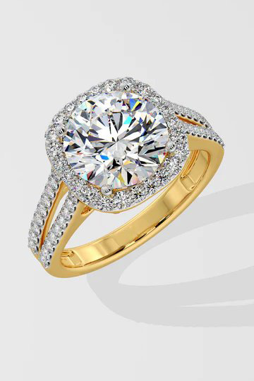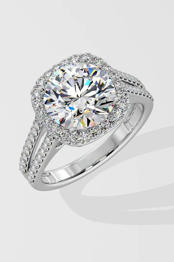 The 3.5 ct Halo Ring, showcases a magnificent 3.5-carat center diamond encircled by a sparkling halo. The double shank, adorned with dazzling diamonds, adds extra brilliance and elegance.