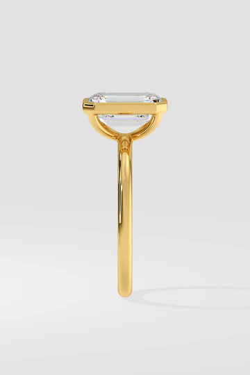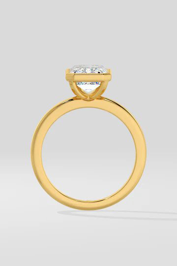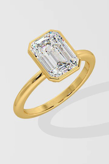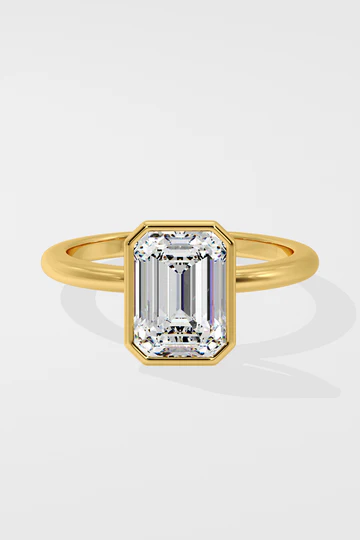 The Ring features a stunning 3 ct emerald cut diamond, securely set in a gold bezel. The bezel setting amplifies the diamond’s brilliance while offering a sleek, modern look.
