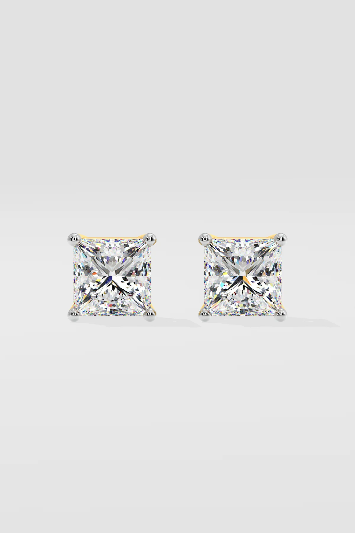 The classic Princess studs, set in 4 prongs are 1.5 ct each diamond. Princess has a bolder, edgier look and breaks away from the classic round to make a stronger yet classic statement. Princess continues to hold high sparkle and combines everyday work and play effortlessly. Customizable in rose or white gold options as well.