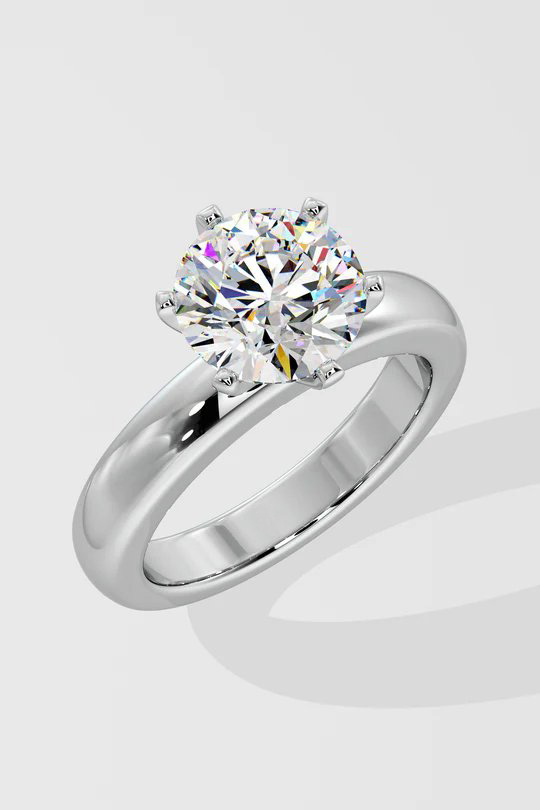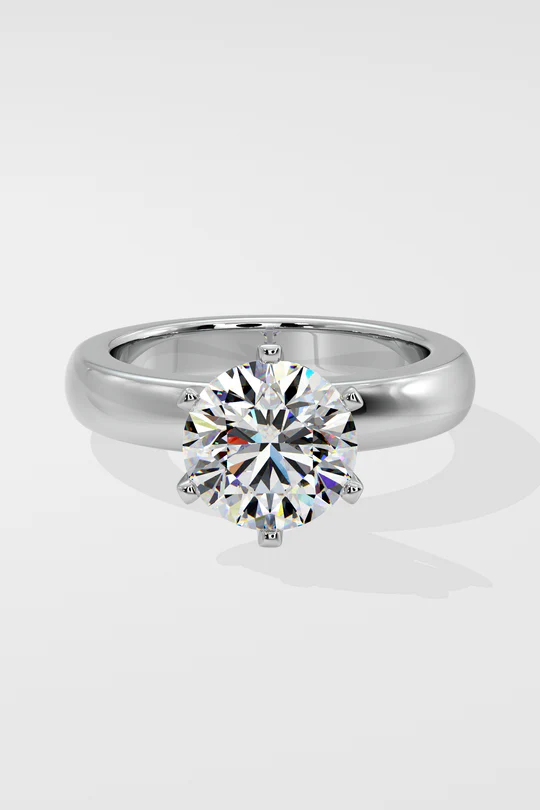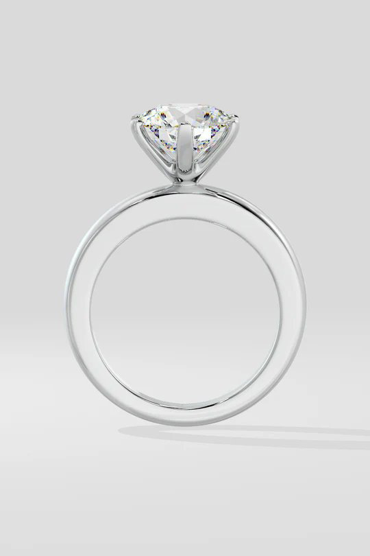 A stunning 3 carat wide band solitaire ring with a secure 6-prong setting, showcasing a brilliant center diamond. The substantial, comfortable band is available in all 3 gold colour options. A bolder band for your bold solitaire.