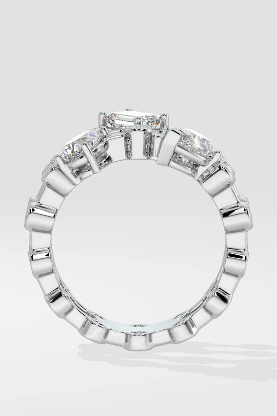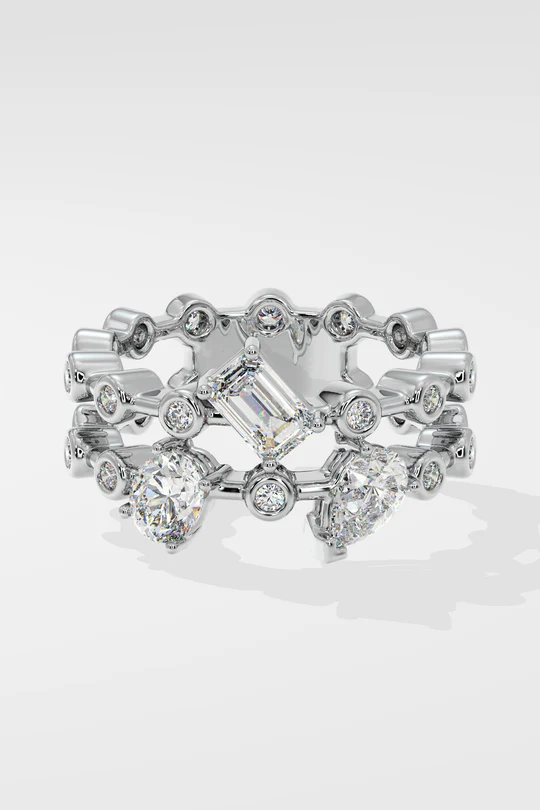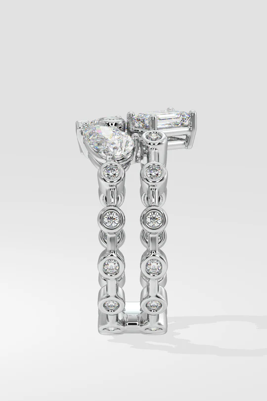 The 3 Stone Double Ring features 1/3 ct Emerald Oval & Pear solitaires. Get the best of all shapes studded over two rows of flush set diamonds with this style. Add flair to your cocktail rings collection.