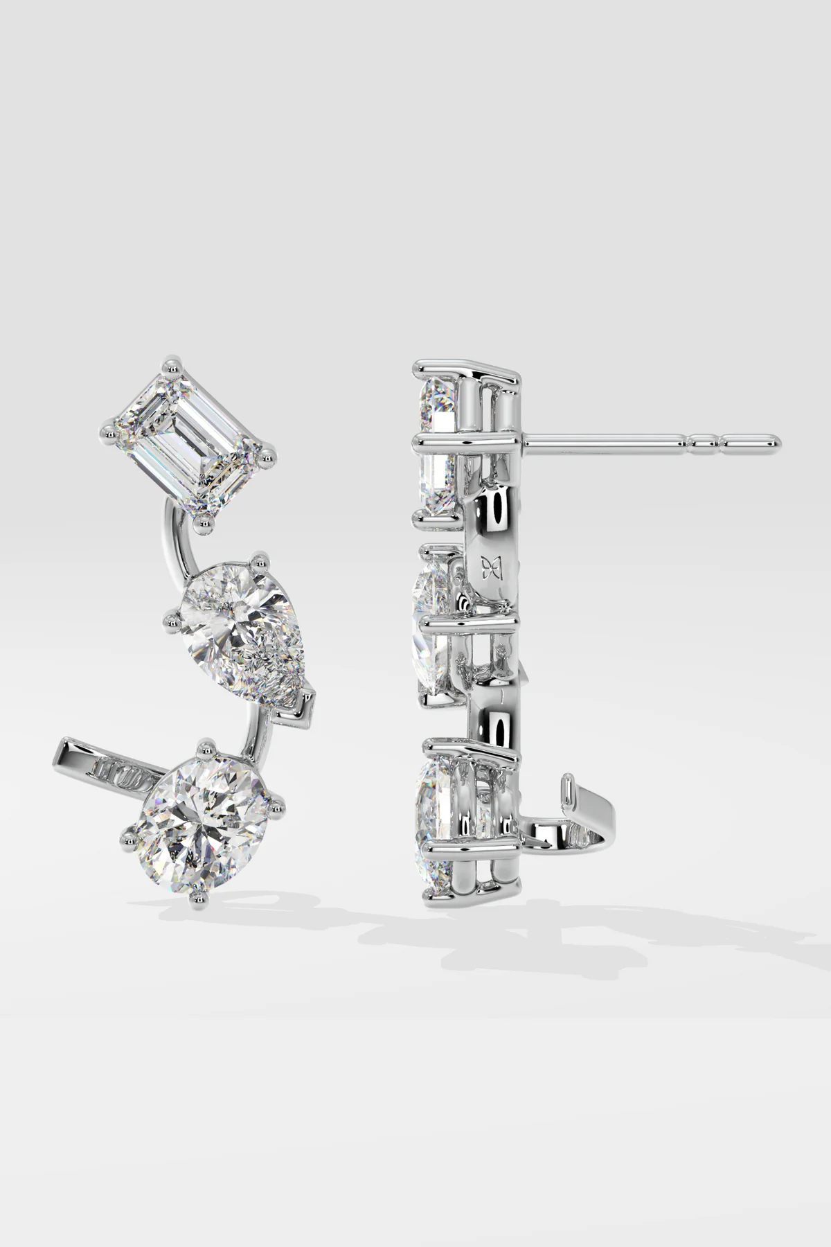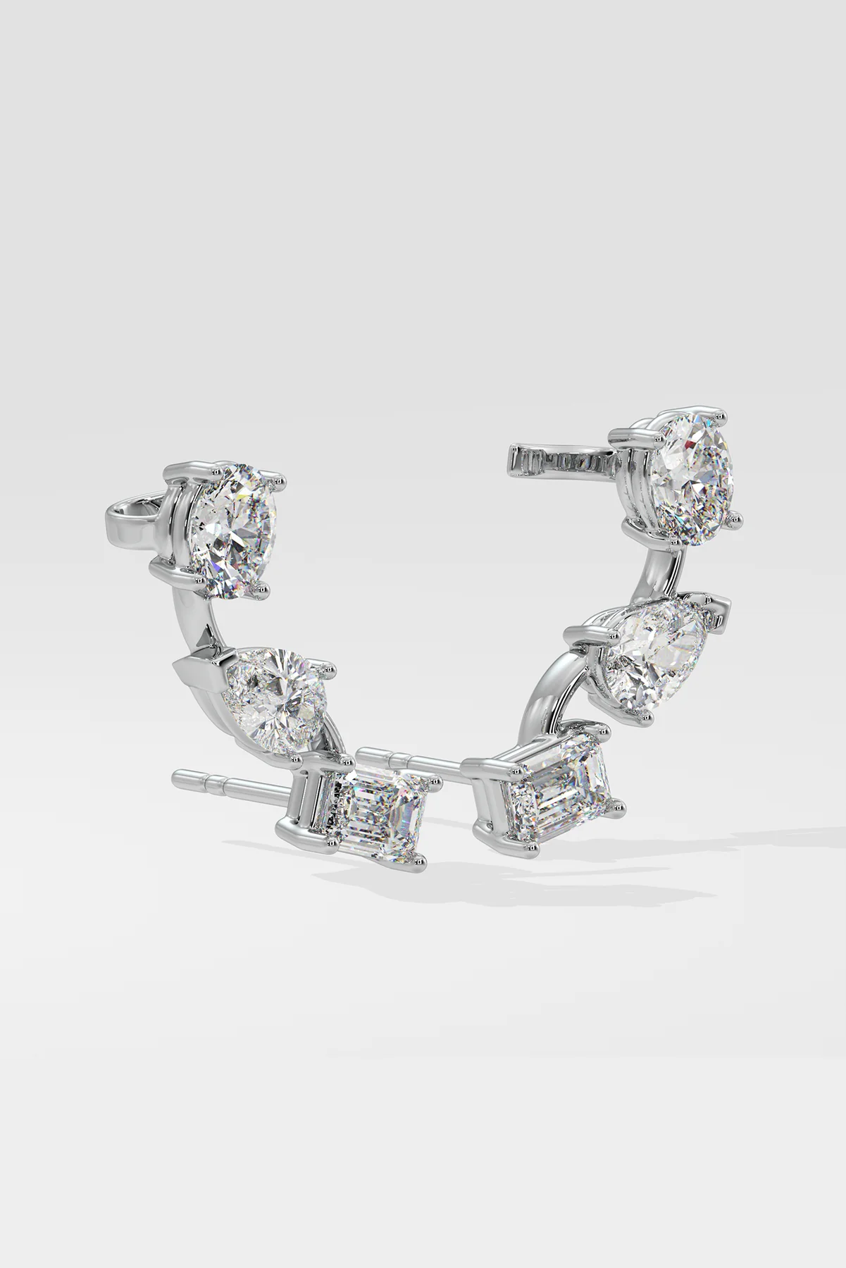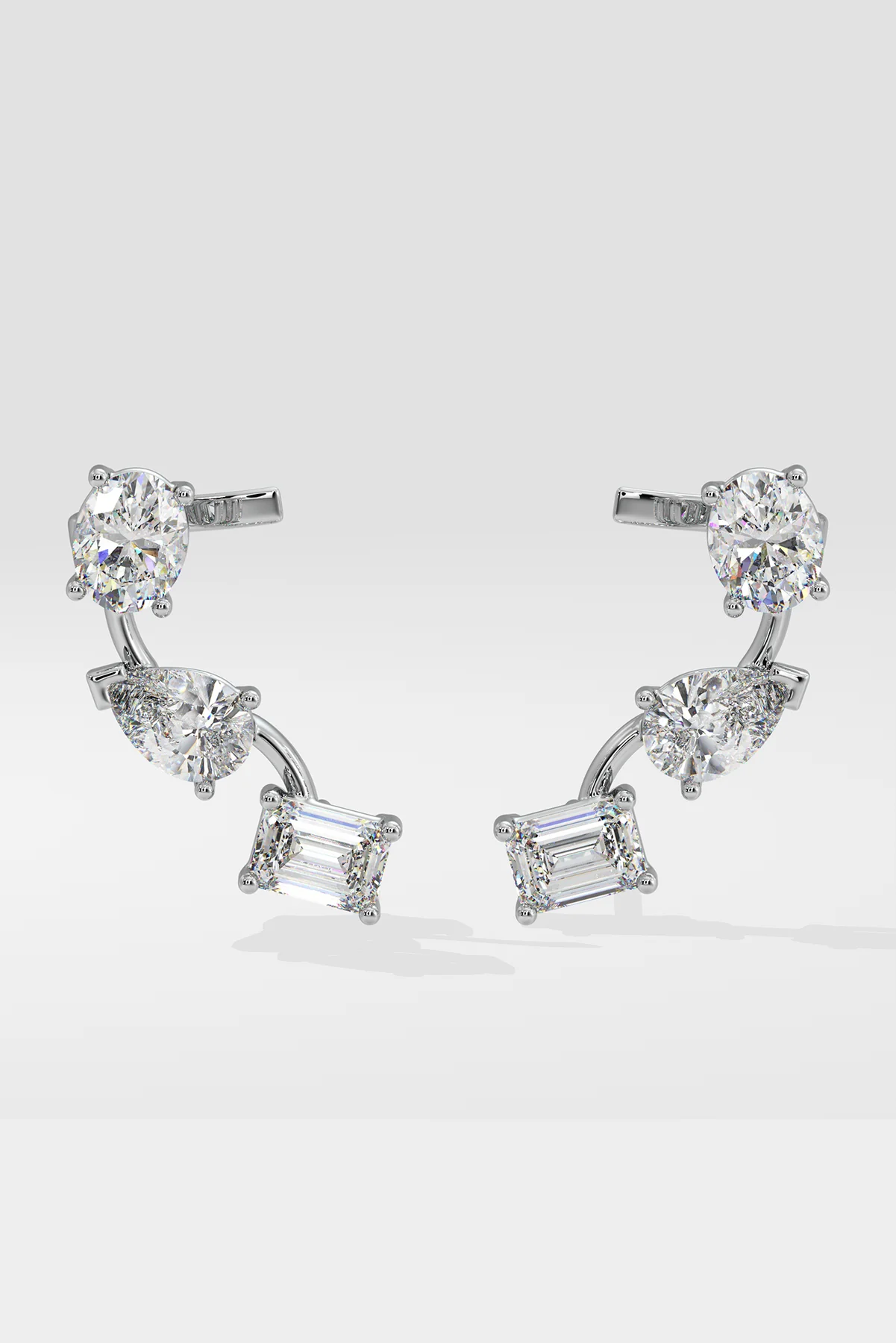 The 3 stone ear cuff studs are mixed shapes in 1/3 ct solitaires. These earrings sit on the ear cuff and have an adjustable hook at the back to firmly secure the hold.