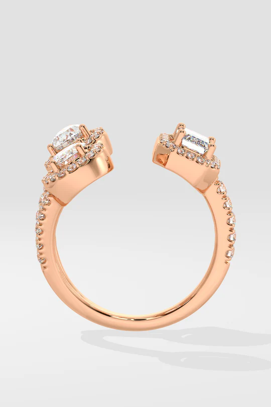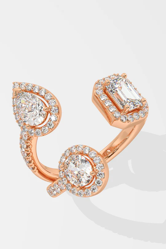 The 3 Stone Gap Halo Ring features 1/3 ct solitaires with a beautiful Halo. The hottest gap ring in our collection, this stunner is a must have for any formal evenings, weddings or night outs.