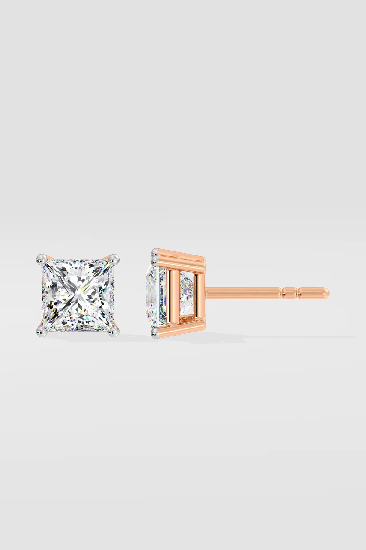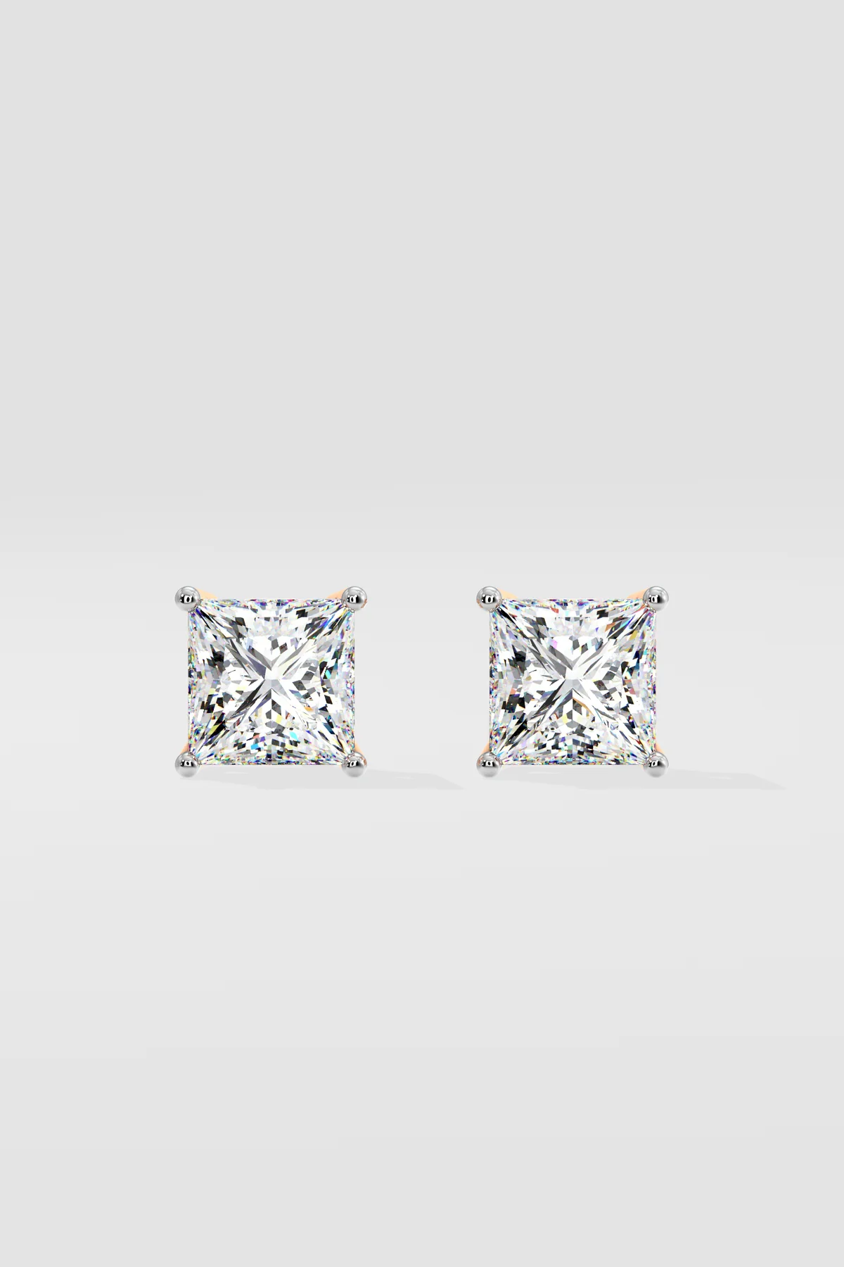 The classic Princess studs, set in 4 prongs are 2 ct each diamond. Princess has a bolder, edgier look and breaks away from the classic round to make a stronger yet classic statement. Princess continues to hold high sparkle and combines everyday work and play effortlessly. Customizable in rose or white gold options as well.