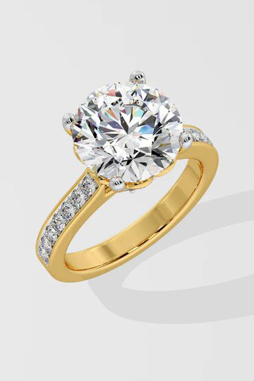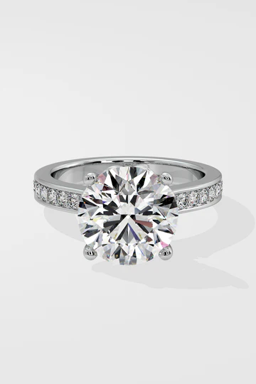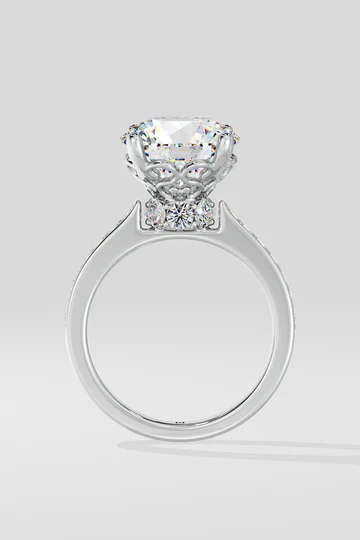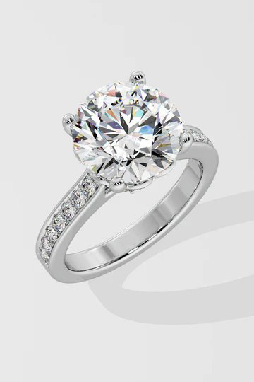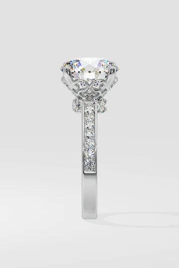 The 4 ct Solitaire Pave Ring showcases an eye popping 4-carat round diamond, set in a sturdy Pave band. The side view reveals intricate detailing, with additional diamonds enhancing the ring’s elegance and sophistication.