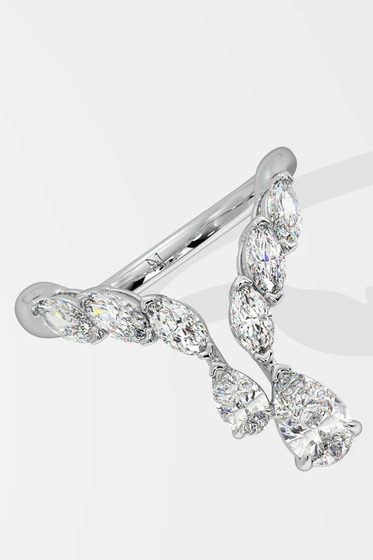 The Aria Two-Stone Ring is an elevating combination of Marquise and Pear diamonds, the larger pear being a 3/4 ct solitaire. A diamond encrusted fashion forward style, this is part of the 2 stone series within Illuminate. The Illuminate collection is built around the fact that with your personality, you’ll always be in the spotlight.