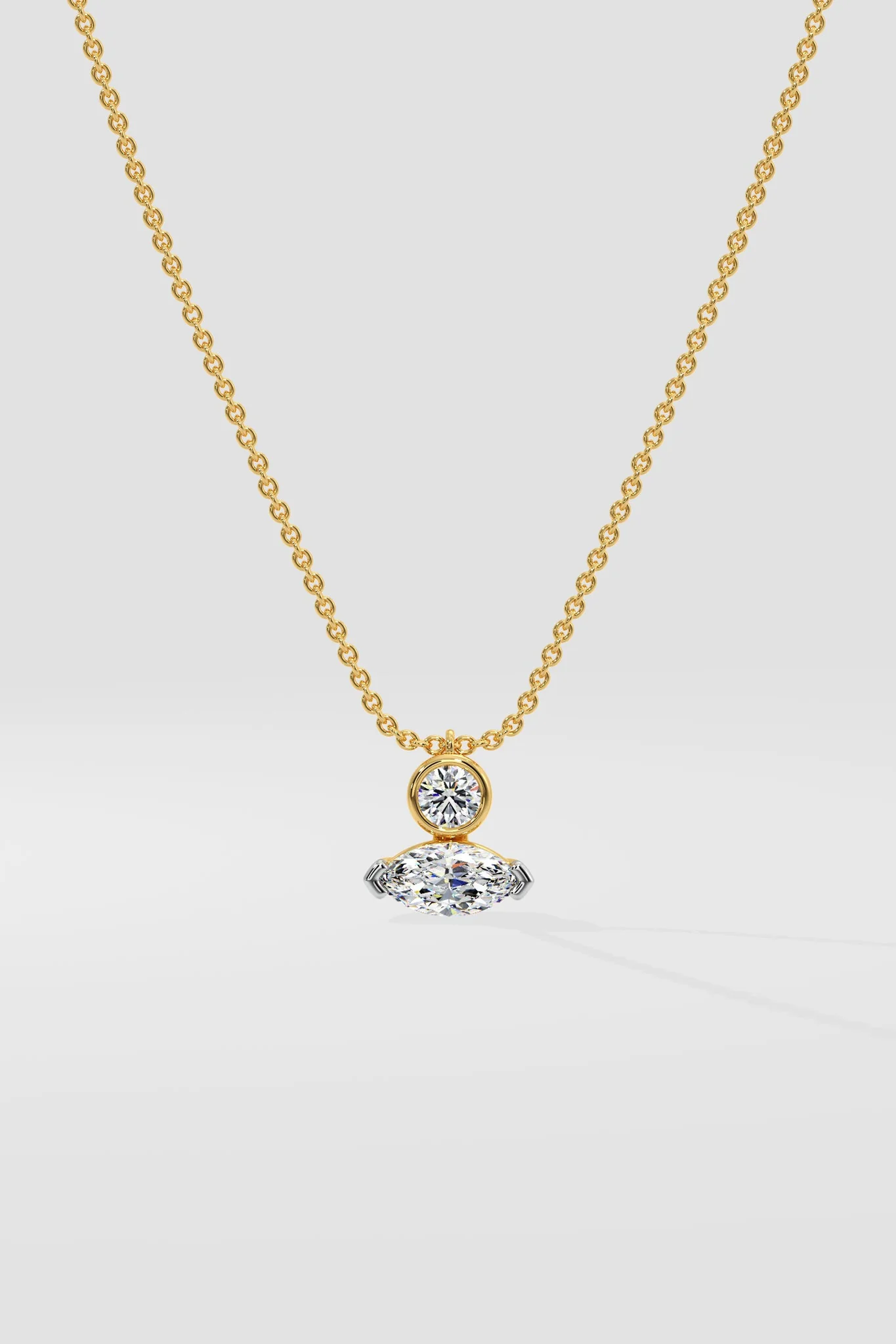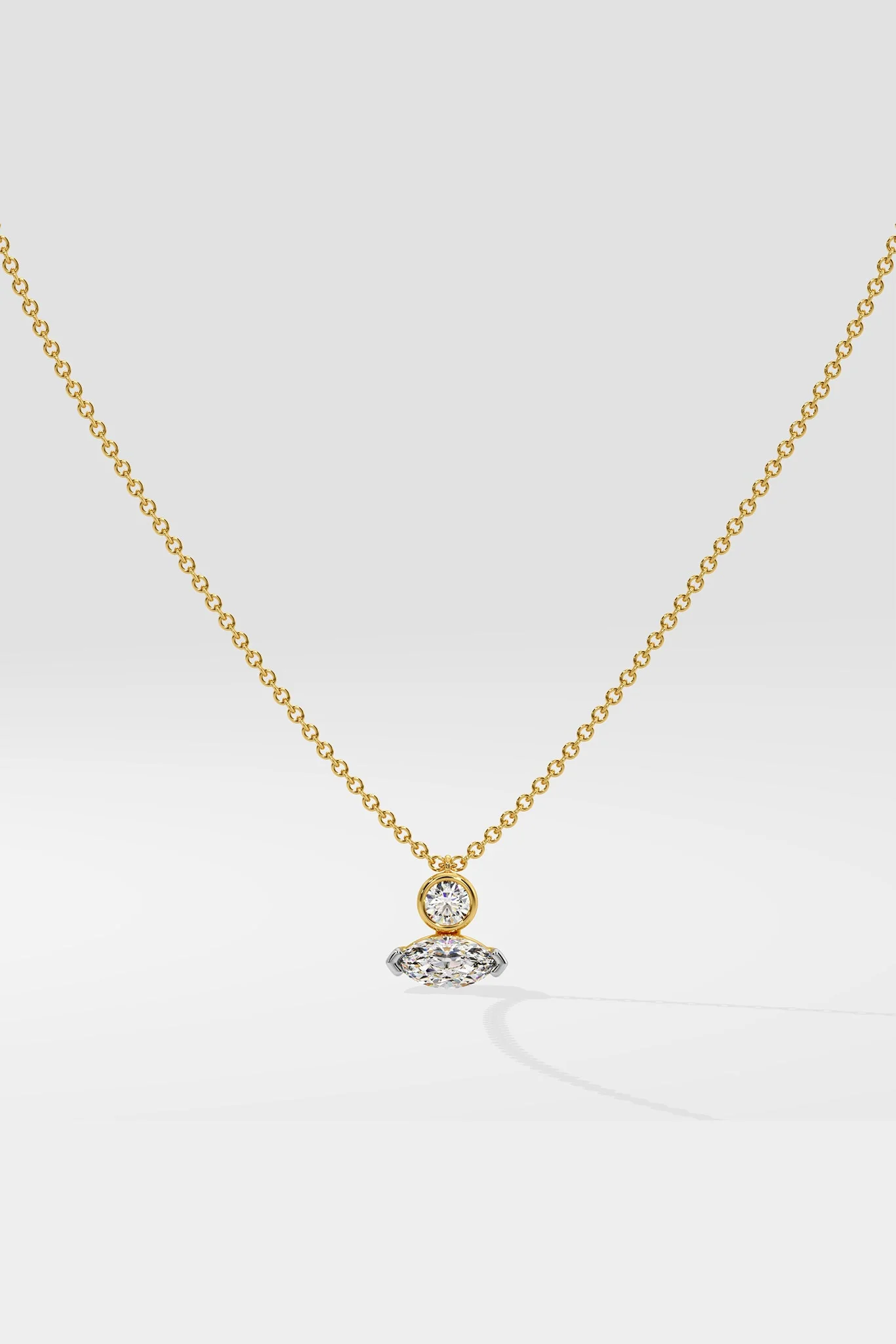 The Drip Duo Necklace features a single 1/3 ct Marquise diamond and a 1/5 ct round brilliant. Part of the T-Shirt diamond collection the duos are a twist on the single diamond stud to give a modern contemporary feel for your daily diamond style. Choose these to add to your essentials or gift a loved one something that they will cherish always.