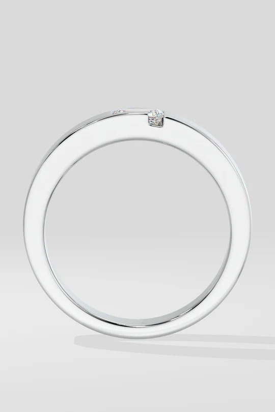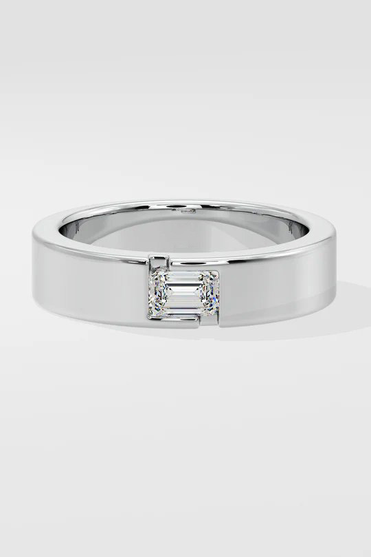 The East-West Emra Band features a 1 ct emerald is bezel set. A classic mens bend with a slight twist in the form of corner gap. works well for everyday wear.
