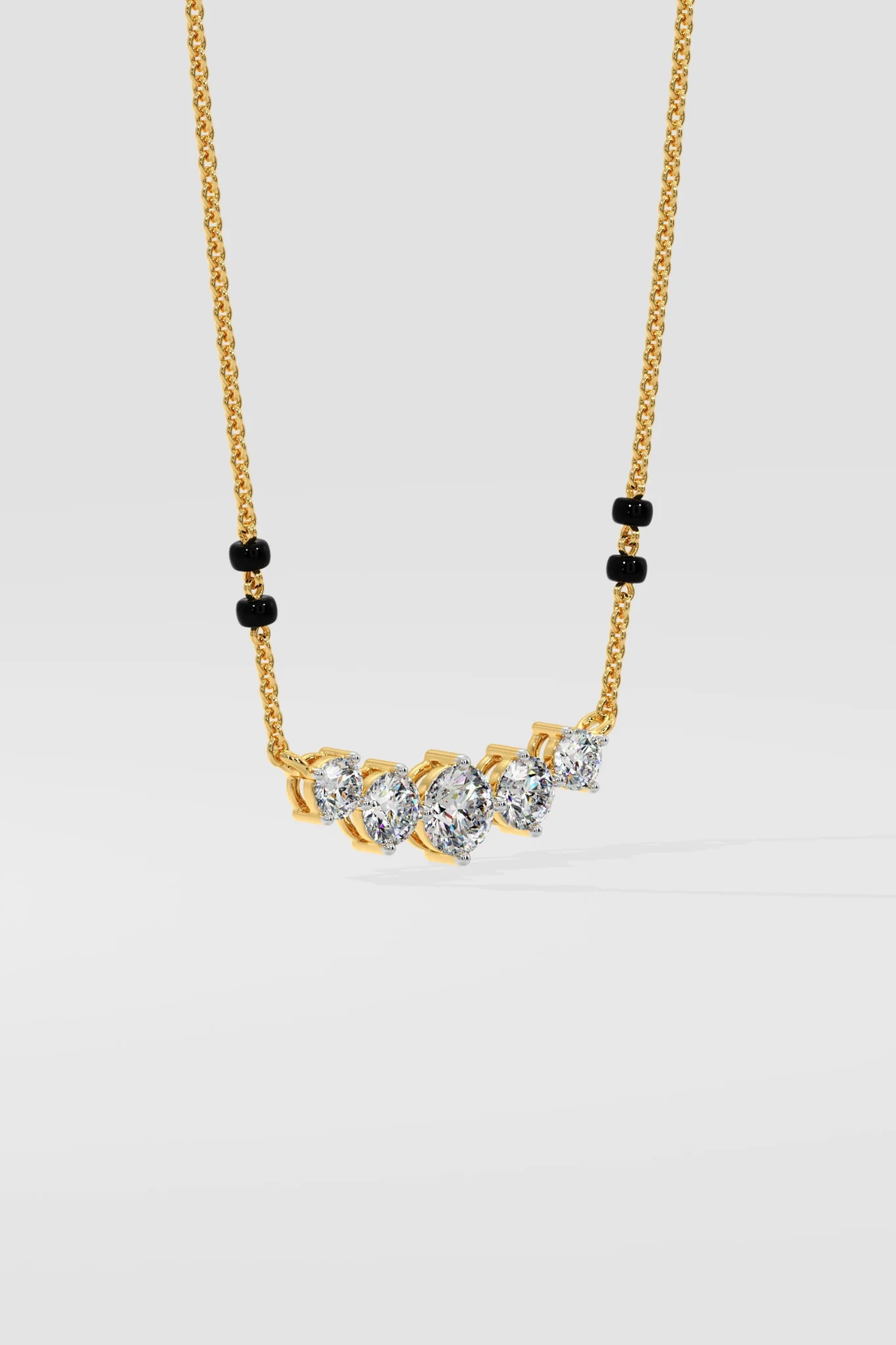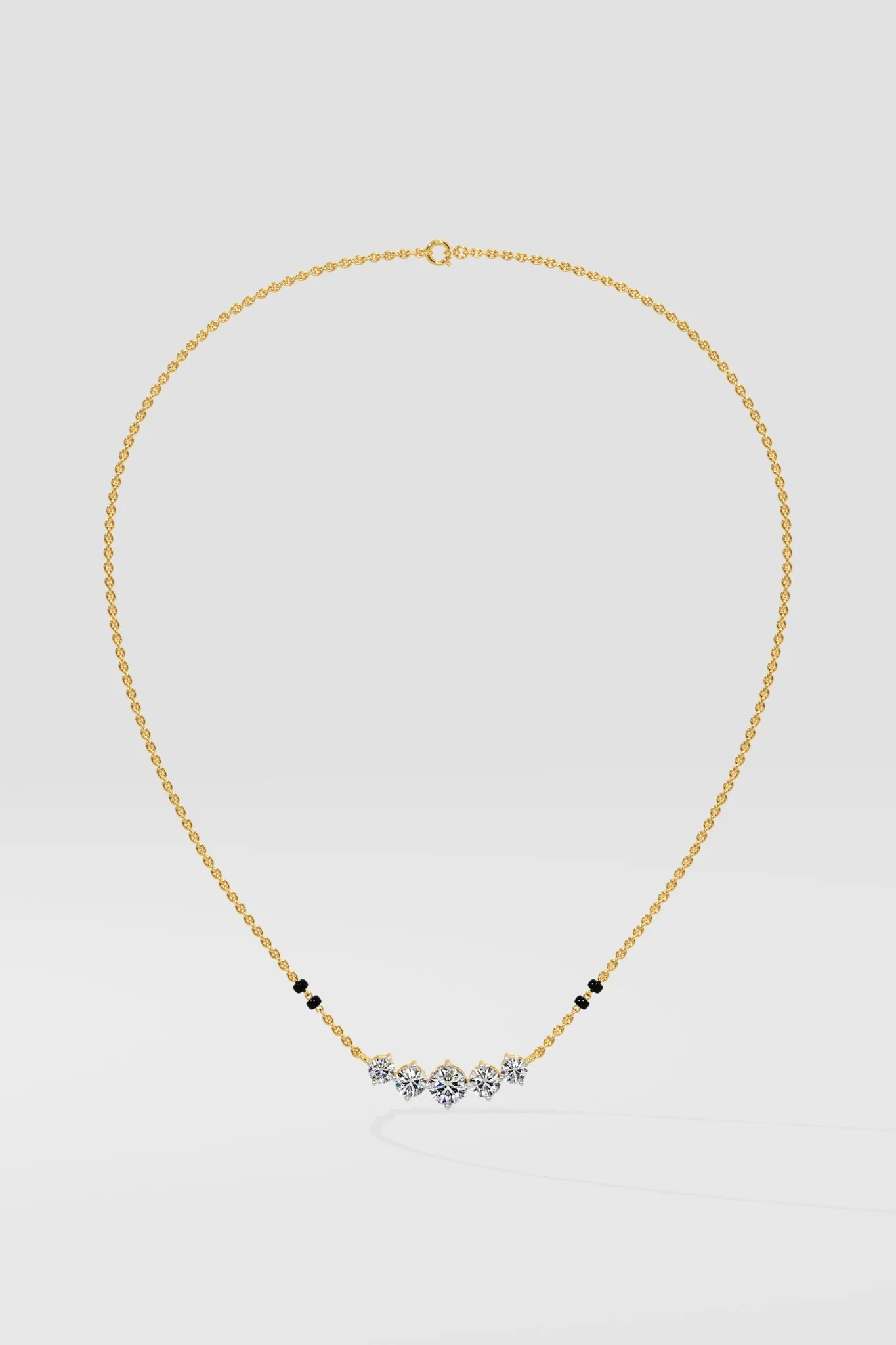 Eternal Sparkle Mangalsutra is a classic 5 stone style, starting with a 0.50 ct center stone and then 0.25 ct & 0.20 ct diamonds on each side respectively. A minimal, beautiful, daily diamond style.