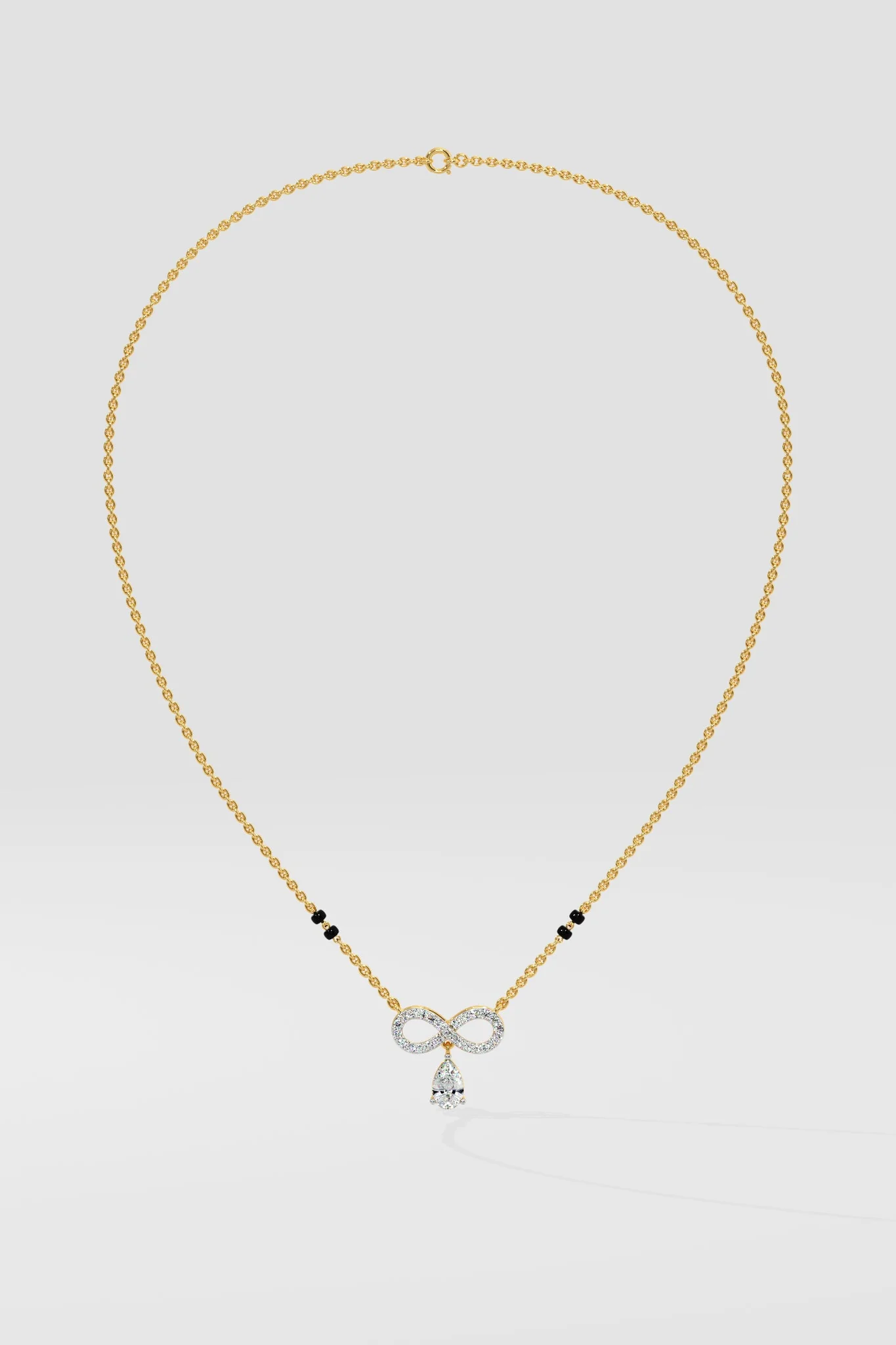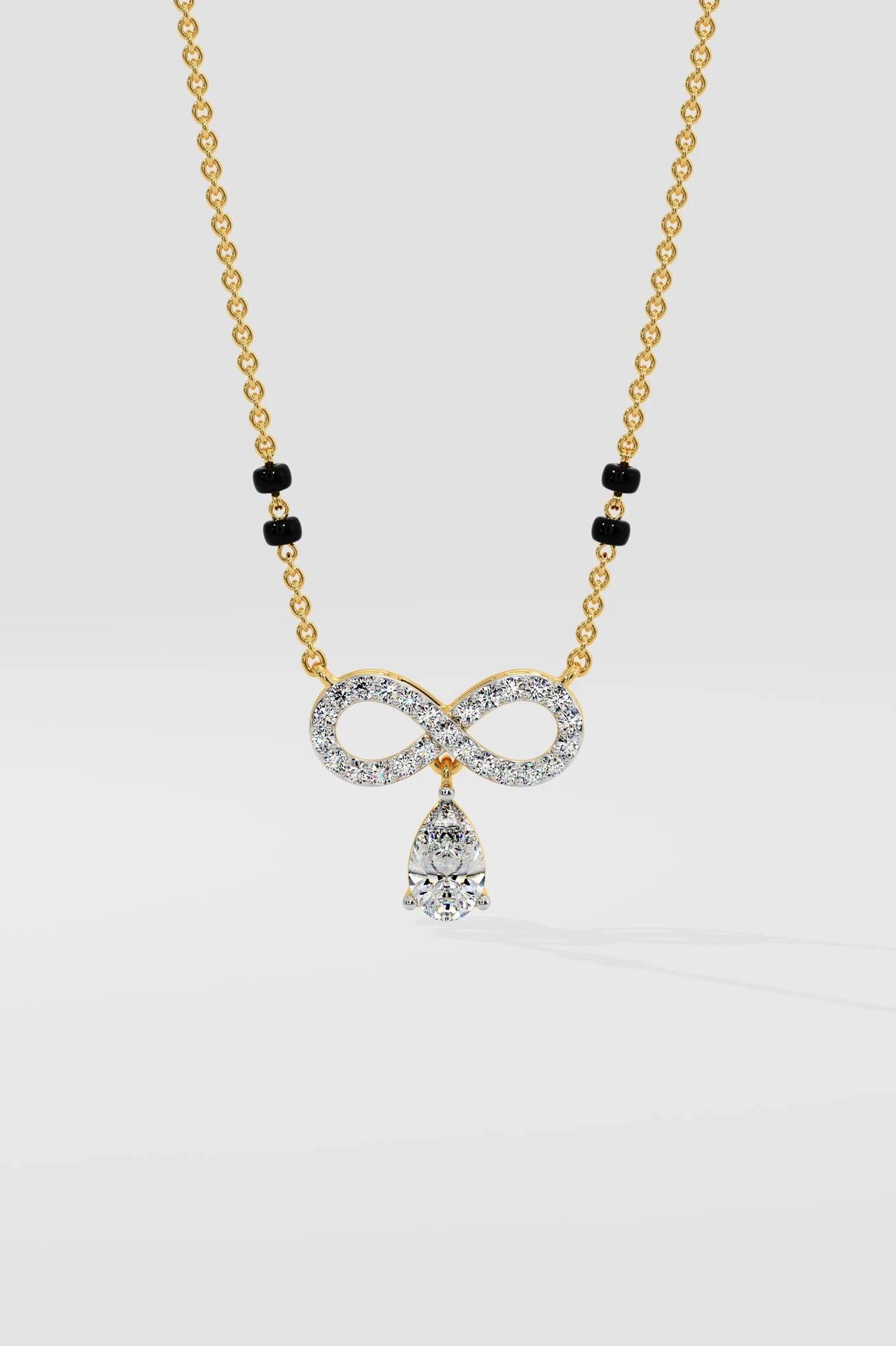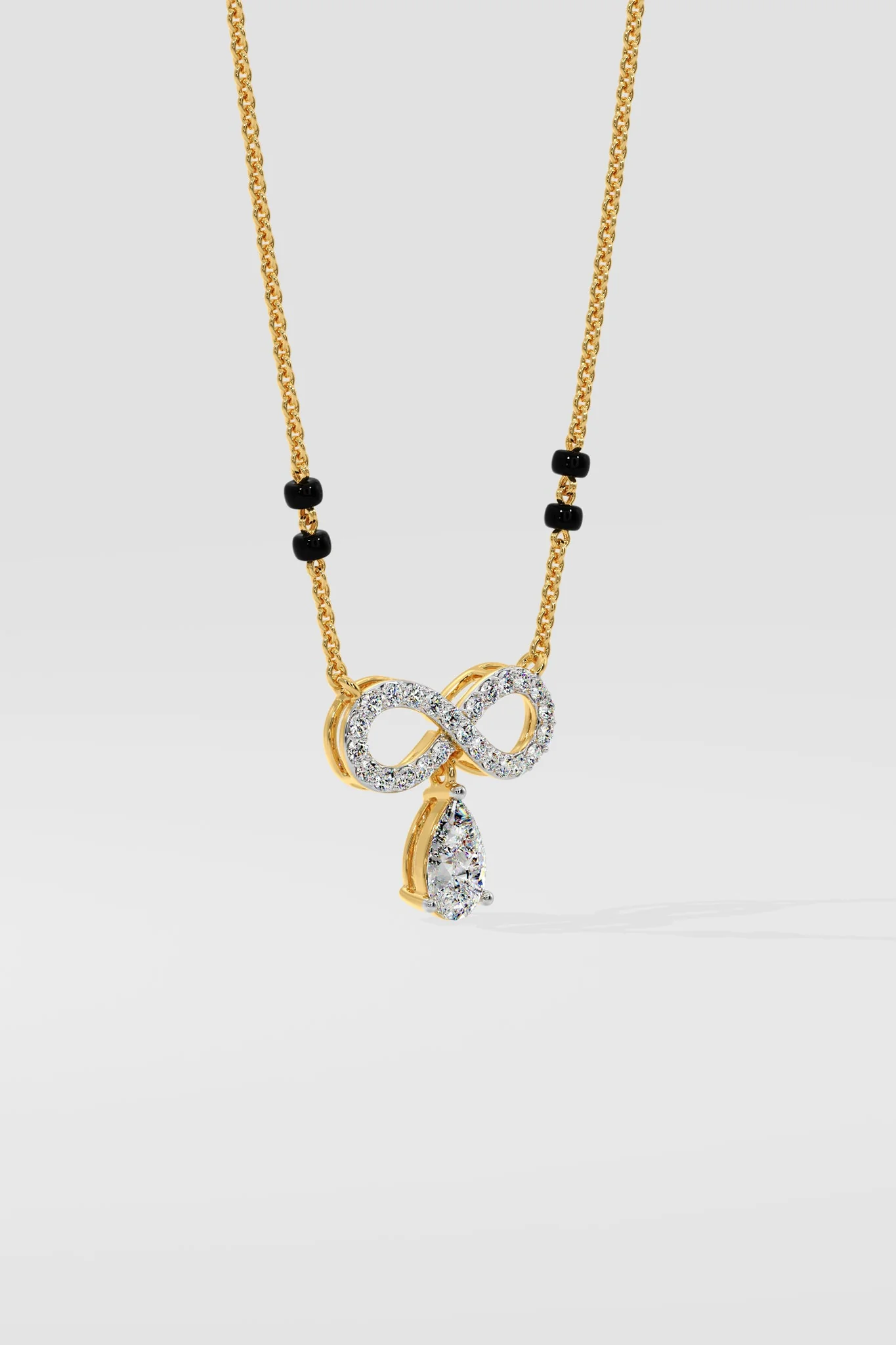 Infinity Pear mangalsutra features an infinity motif set with diamonds and a 1ct pear-shaped solitaire at the center. A gold chain with black beads completes the design.