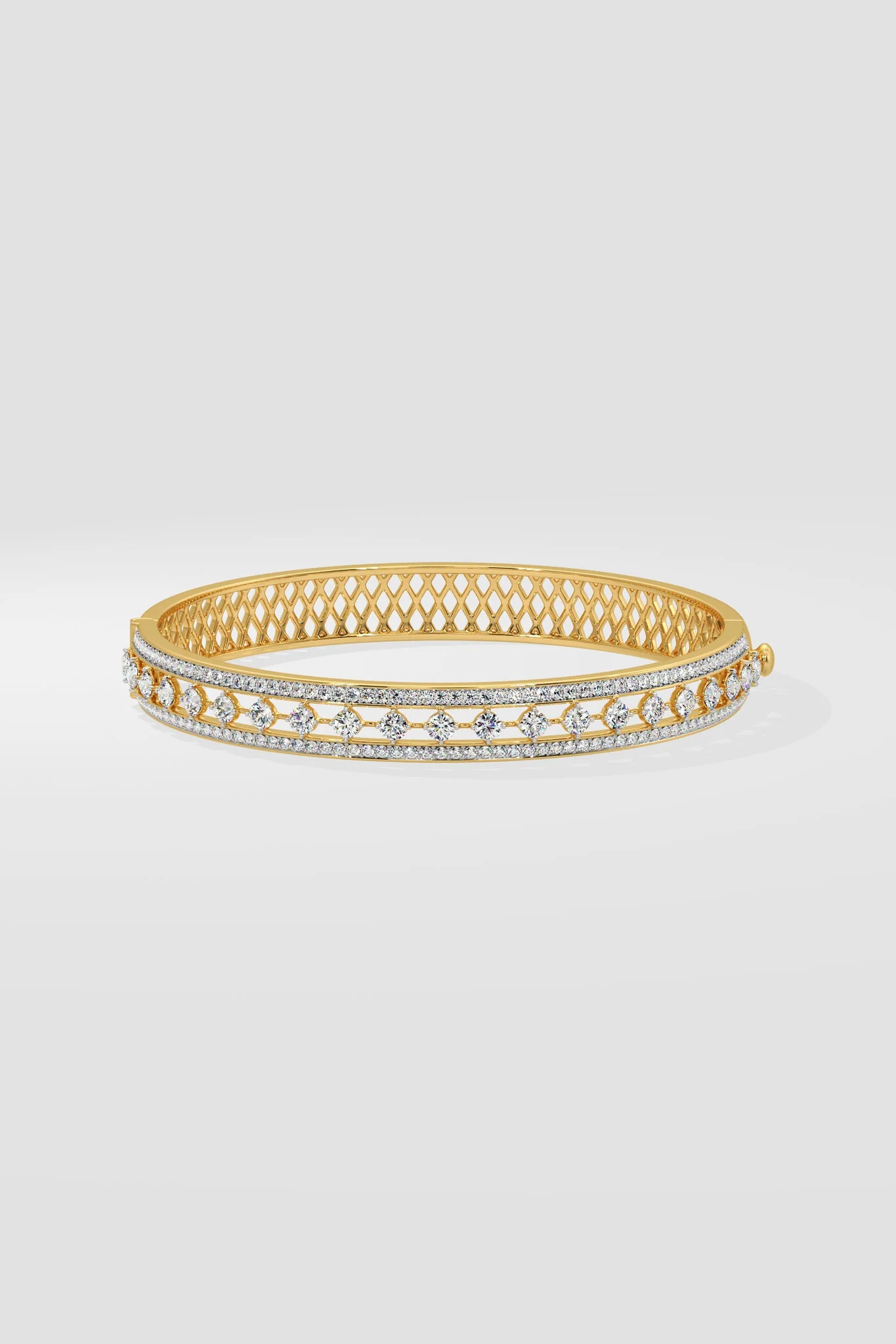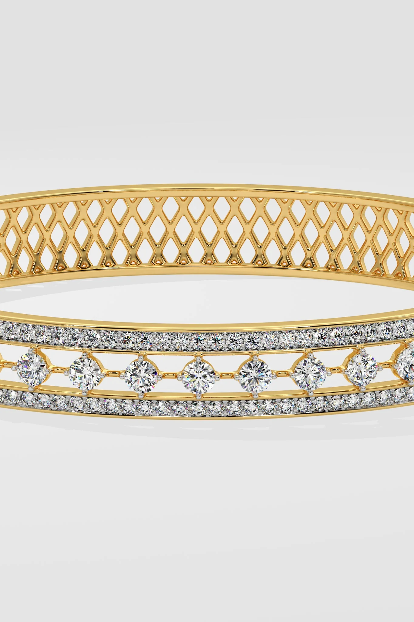 The Intricate Trio Bangle, features a sparkling 0.08 ct diamond row at its centre, complemented by a delicate line of diamonds along the top and bottom. This bangle is a light weight beauty offering a wider and fuller look.