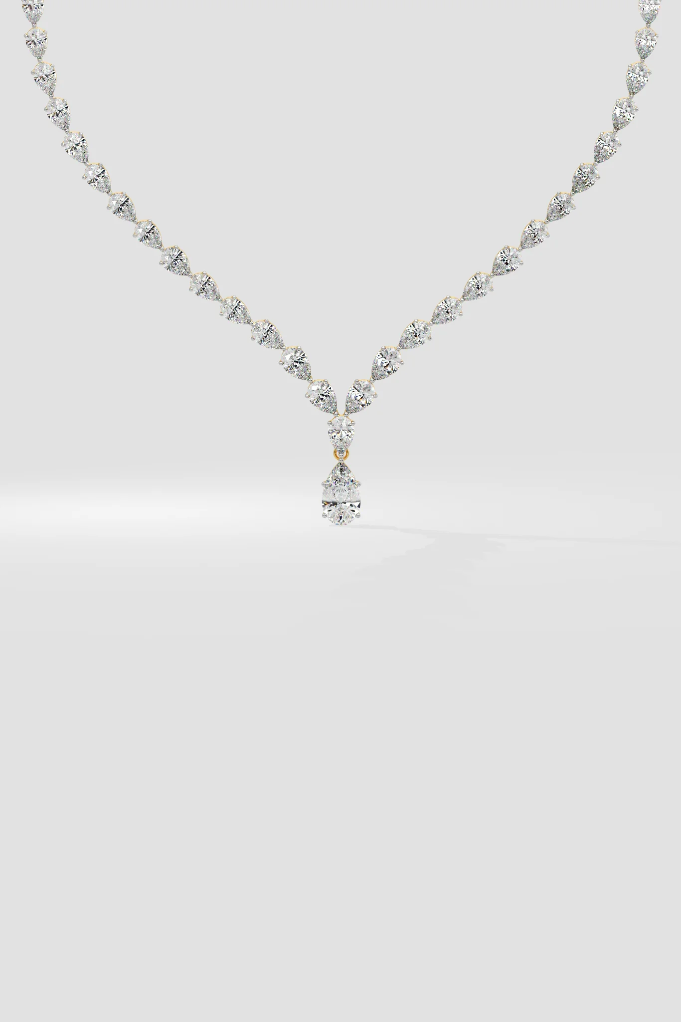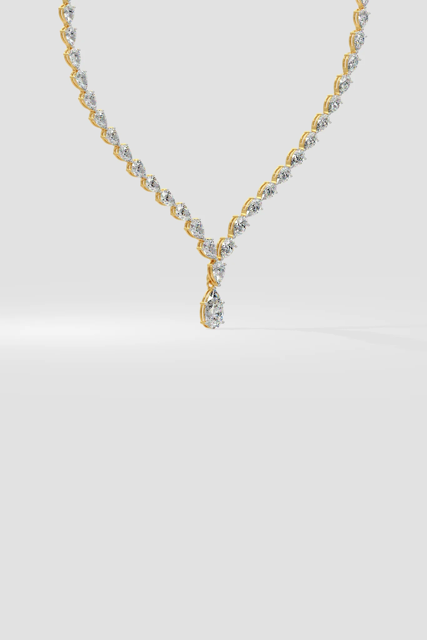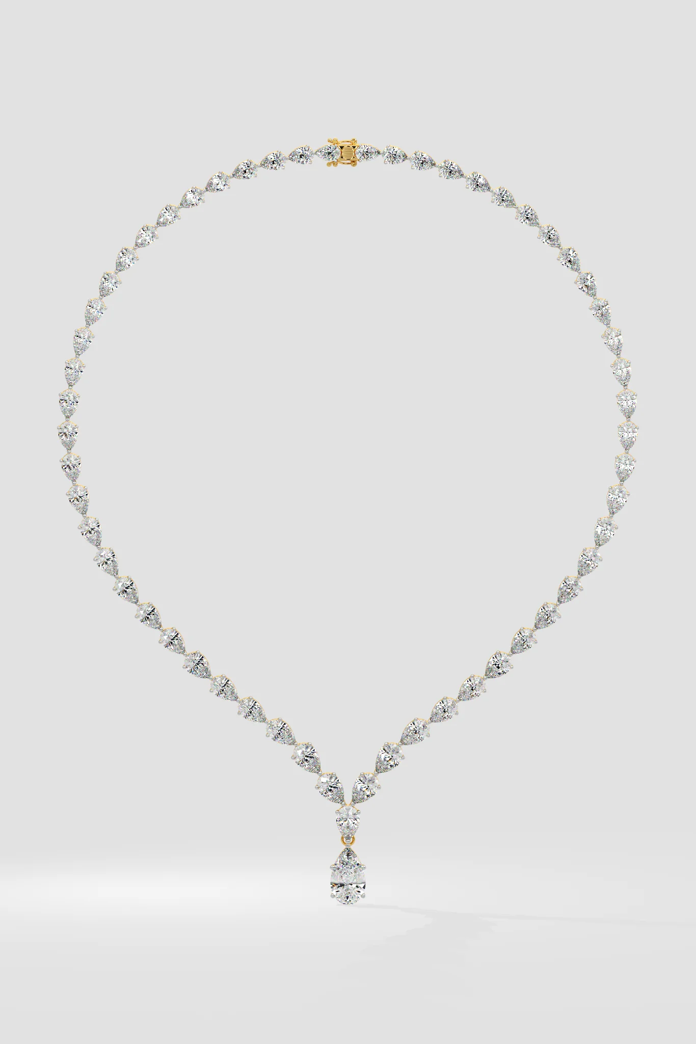 The Linea Pear Necklace is a classic masterpiece in perfectly proportioned pear diamonds. All attention gravitates towards the magnificent center: a 10 ct solitaire drop which is the highlight of this stunning jewel.