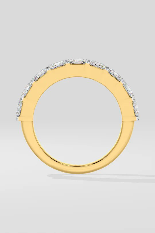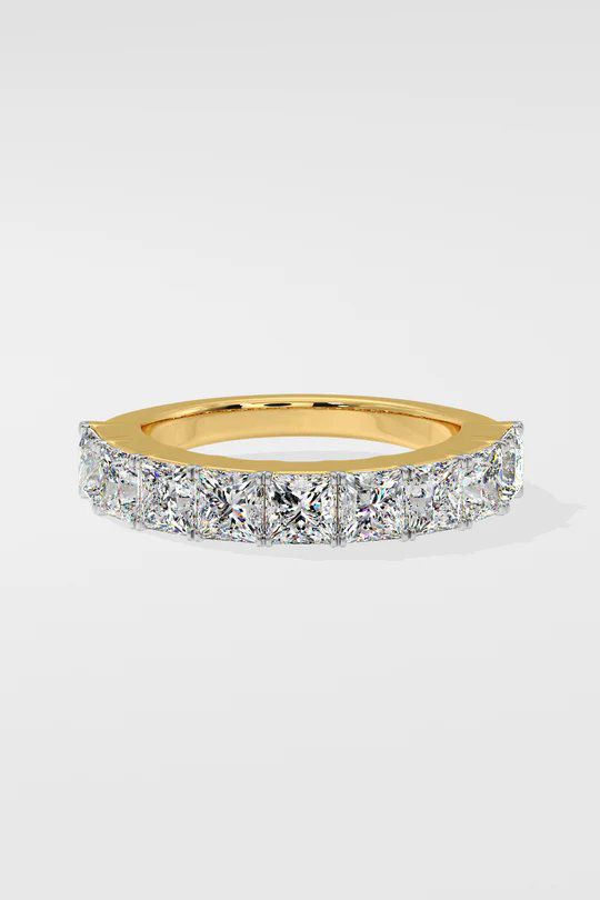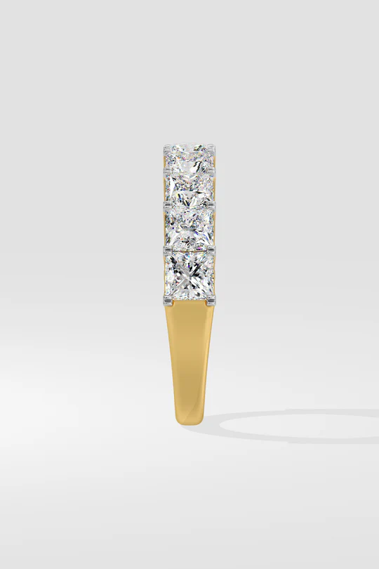The classic Princess Half Eternity Band is a favorite sparkly diamond band. Its timeless design perfectly complements any solitaire ring with a seamless row of dazzling 0.20 ct princess cut diamonds.