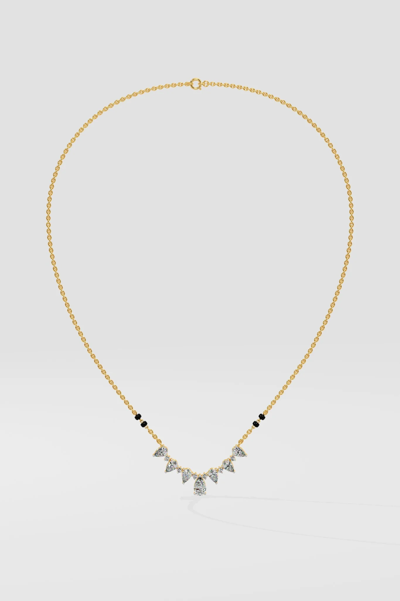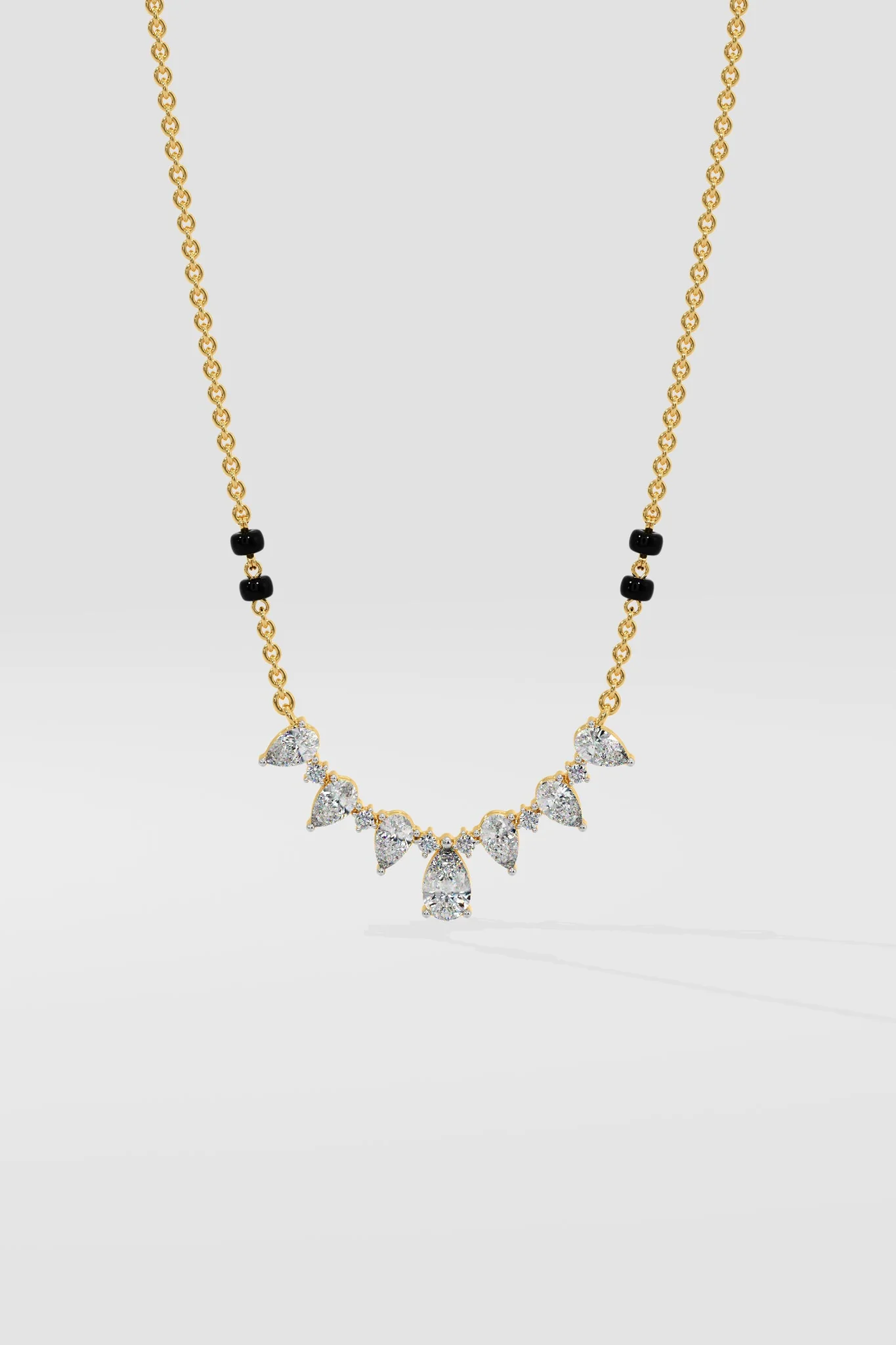 The Seven Stone Mangalsutra feature seven pear shapes diamonds starting with a 0.50 ct center, interspersed with small rounds. A modern take on the seven marital vows, this beautiful piece is the perfect diamond style for your new bridal journey.