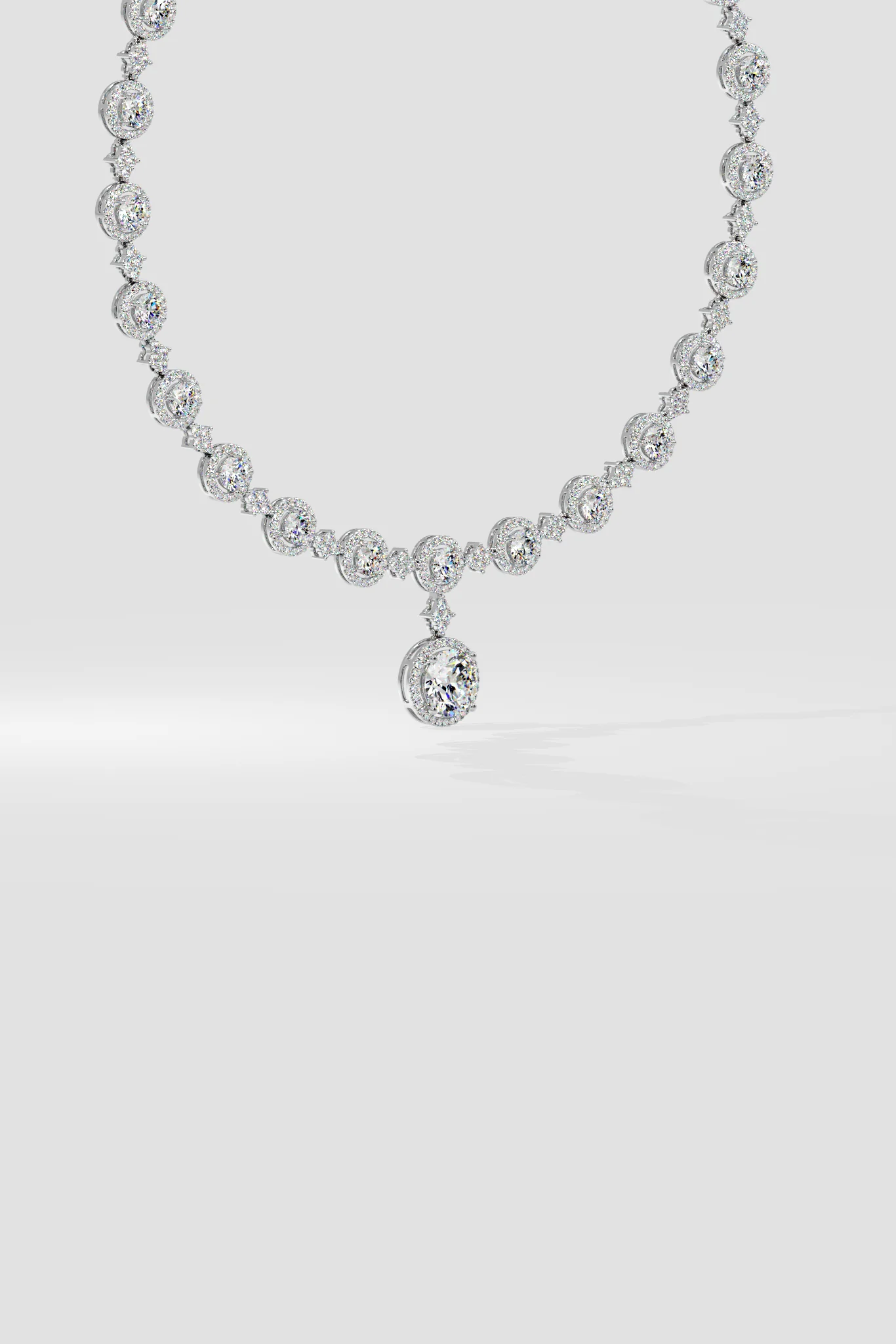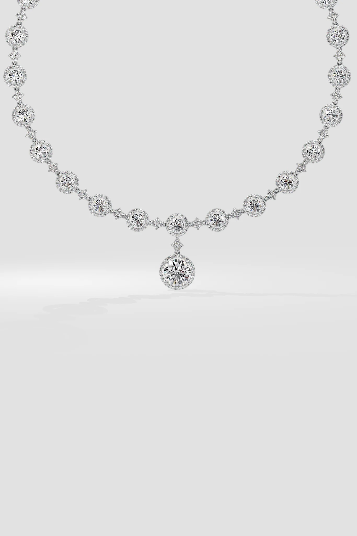 The Astoria Necklace features a 4 ct round center diamond, surrounded by a halo for added brilliance. Each round diamond along the necklace is also framed with a halo, creating a seamless and balanced design. A refined piece that stands out with its regal sparkle.