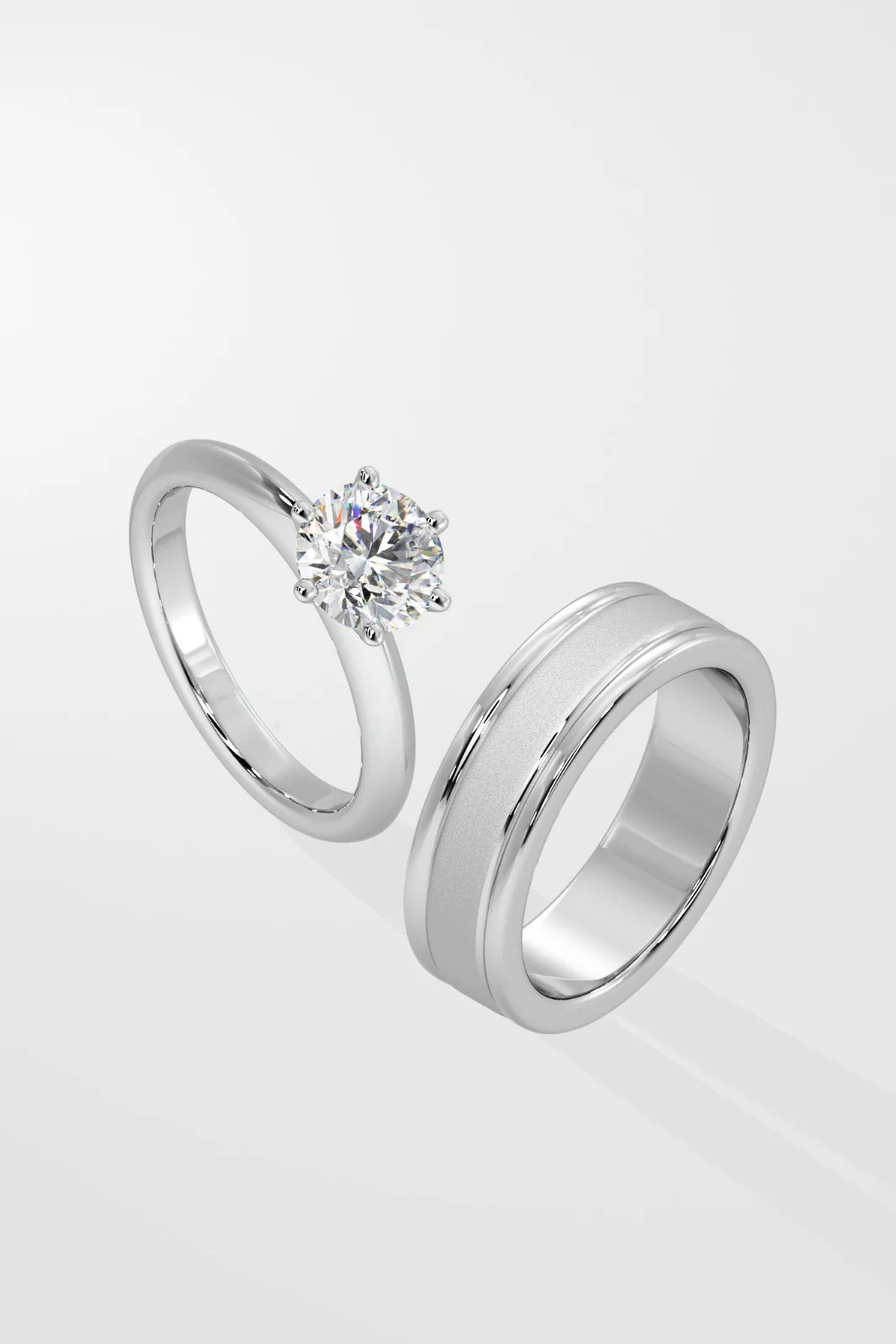The Hermosa Couple Band features a 2 ct Round diamond for the women’s ring. The Men’s Gold band is Minimal & Classic. The perfect yin & yang for your love story, our bands are designed not to replicate but to complement each other.