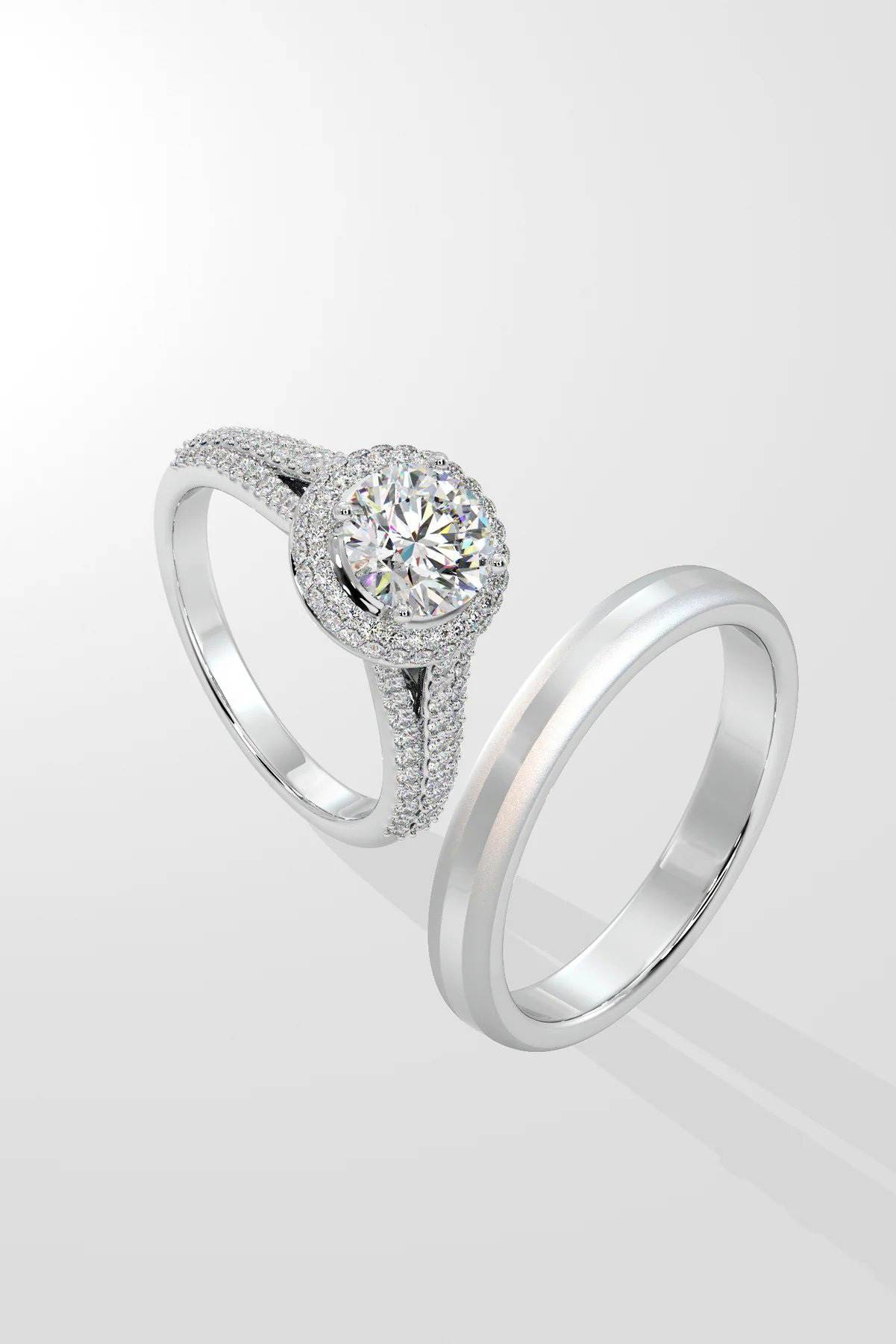 The Majestic Couple Band features a 1 ct Round diamond for the women’s ring. The Men’s Gold band is Minimal & Classic. The perfect yin & yang for your love story, our bands are designed not to replicate but to complement each other.