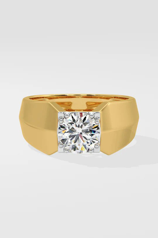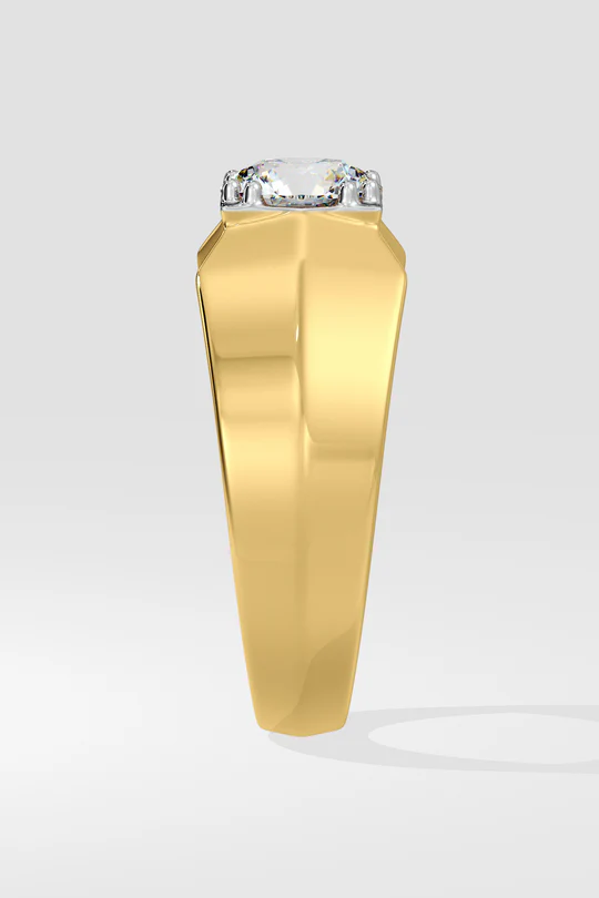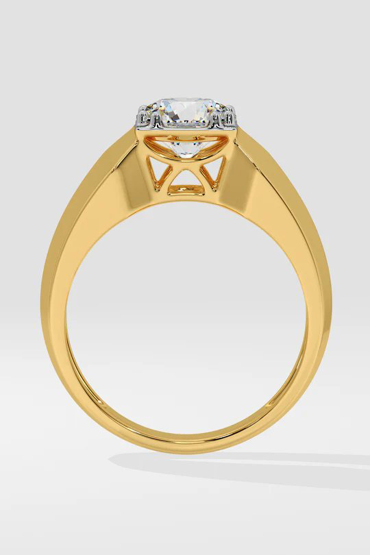 The Regal Solitaire Ring is a royal, elevated and full bodied diamond ring with a 2 ct round brilliant. The broad band has the knife edge separation which tapers towards the bottom.