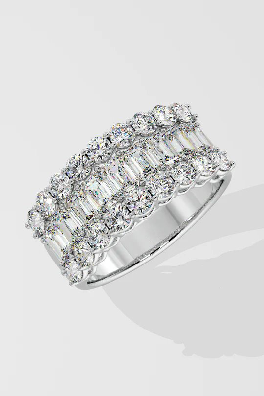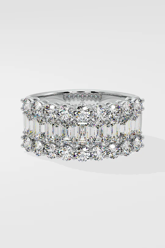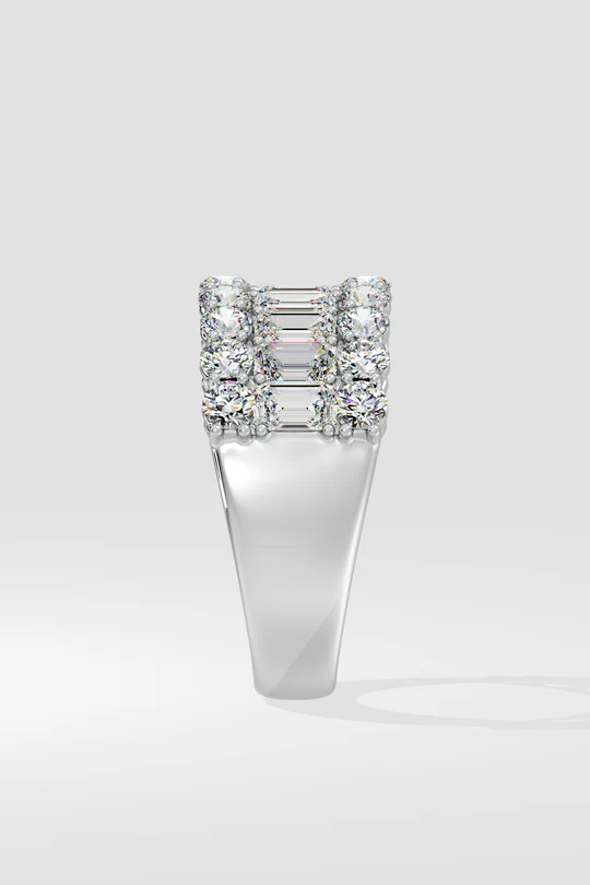 The Triad Glamour Band features a 0.25 ct emerald-cut diamond flanked by 0.10-ct round diamonds, creating a bold yet simple design. Its stacking effect adds versatility, making it perfect for any occasion.