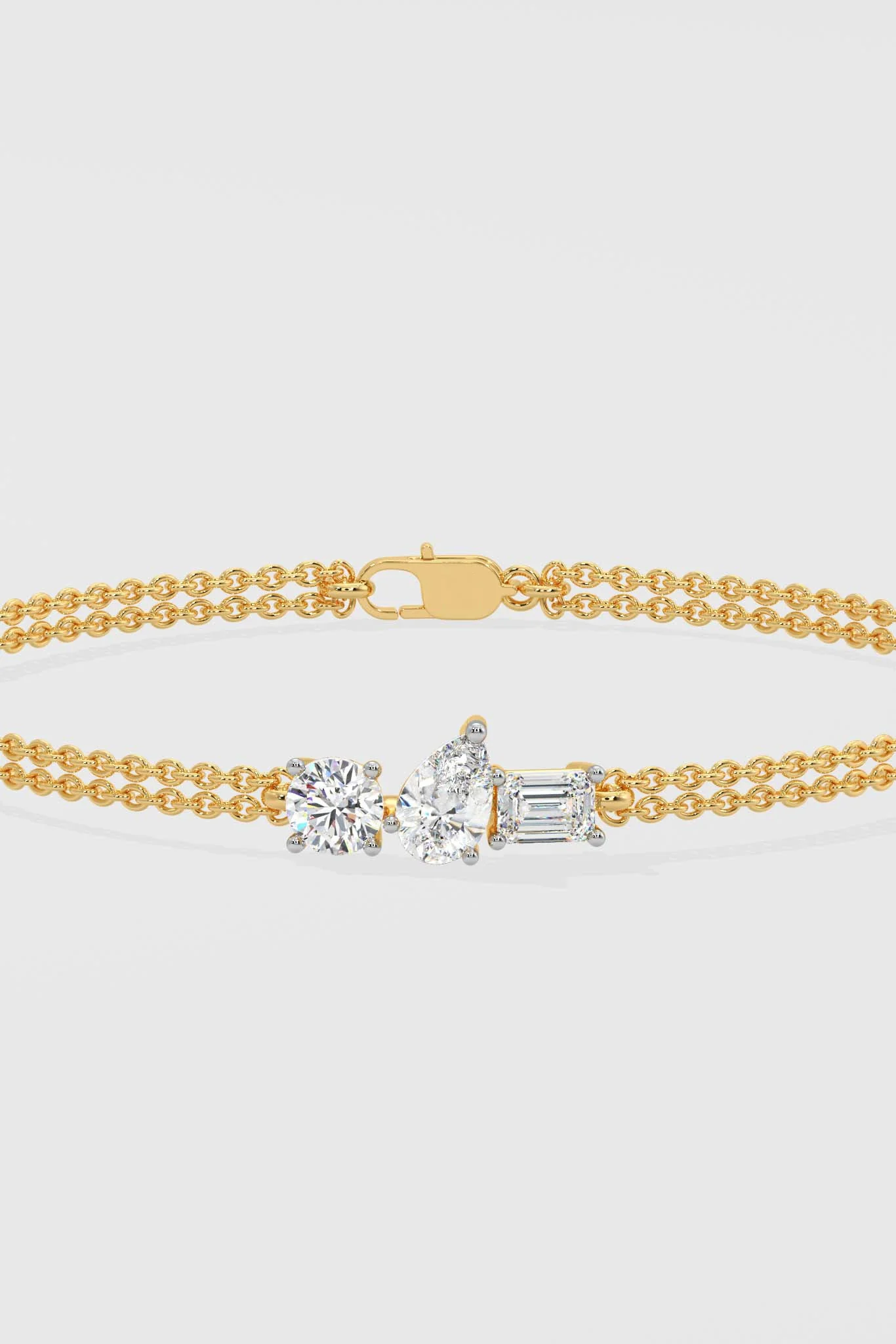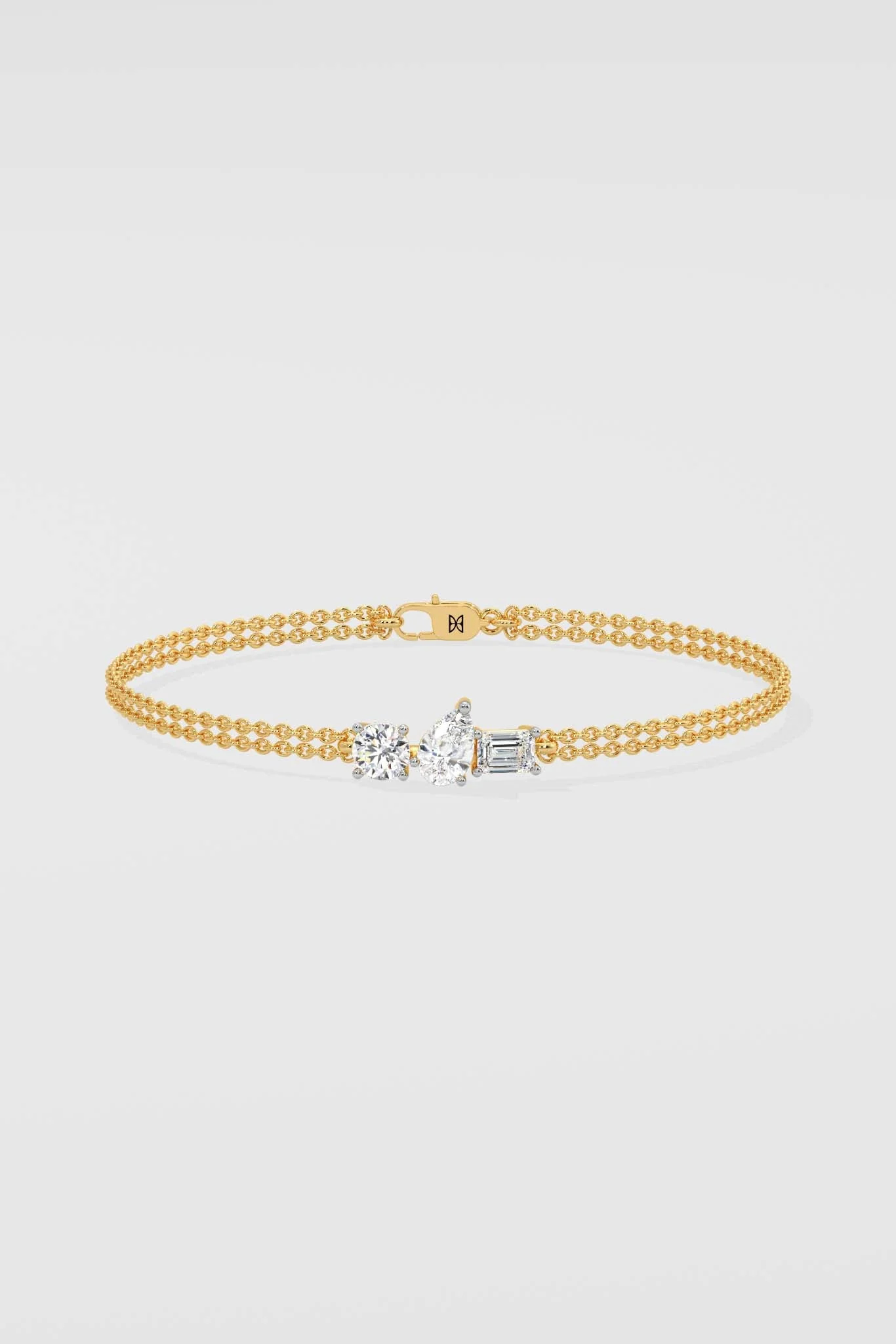 The Beyond Trio Bracelet is light, easy and a minimalist addition to your wrist stack. Featuring three 1/5 ct diamonds stacked together in different shapes and a beautiful double row gold chain. Beyond Classics is where Natasha & HOQ are commingling a cool, casual and effortless style.