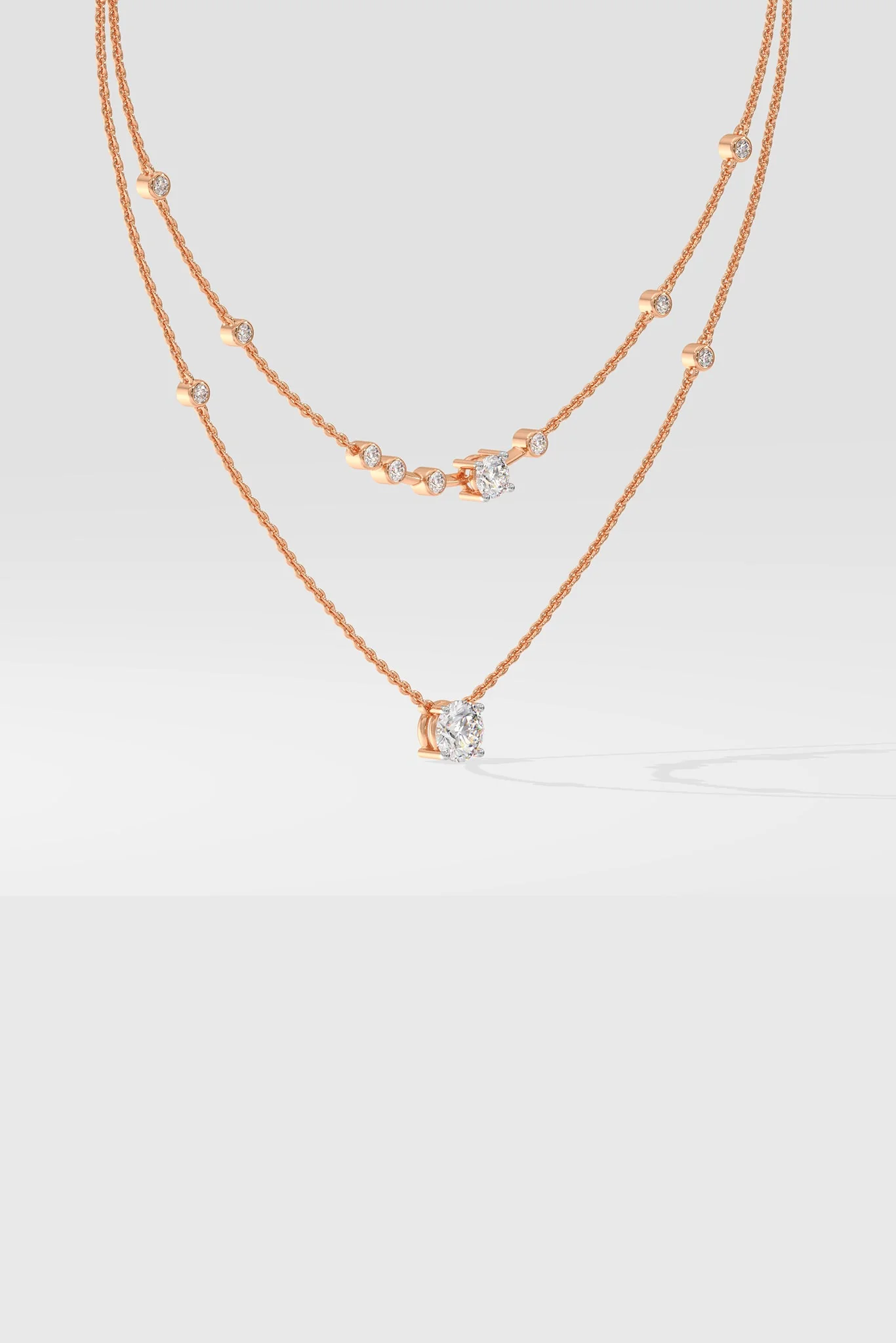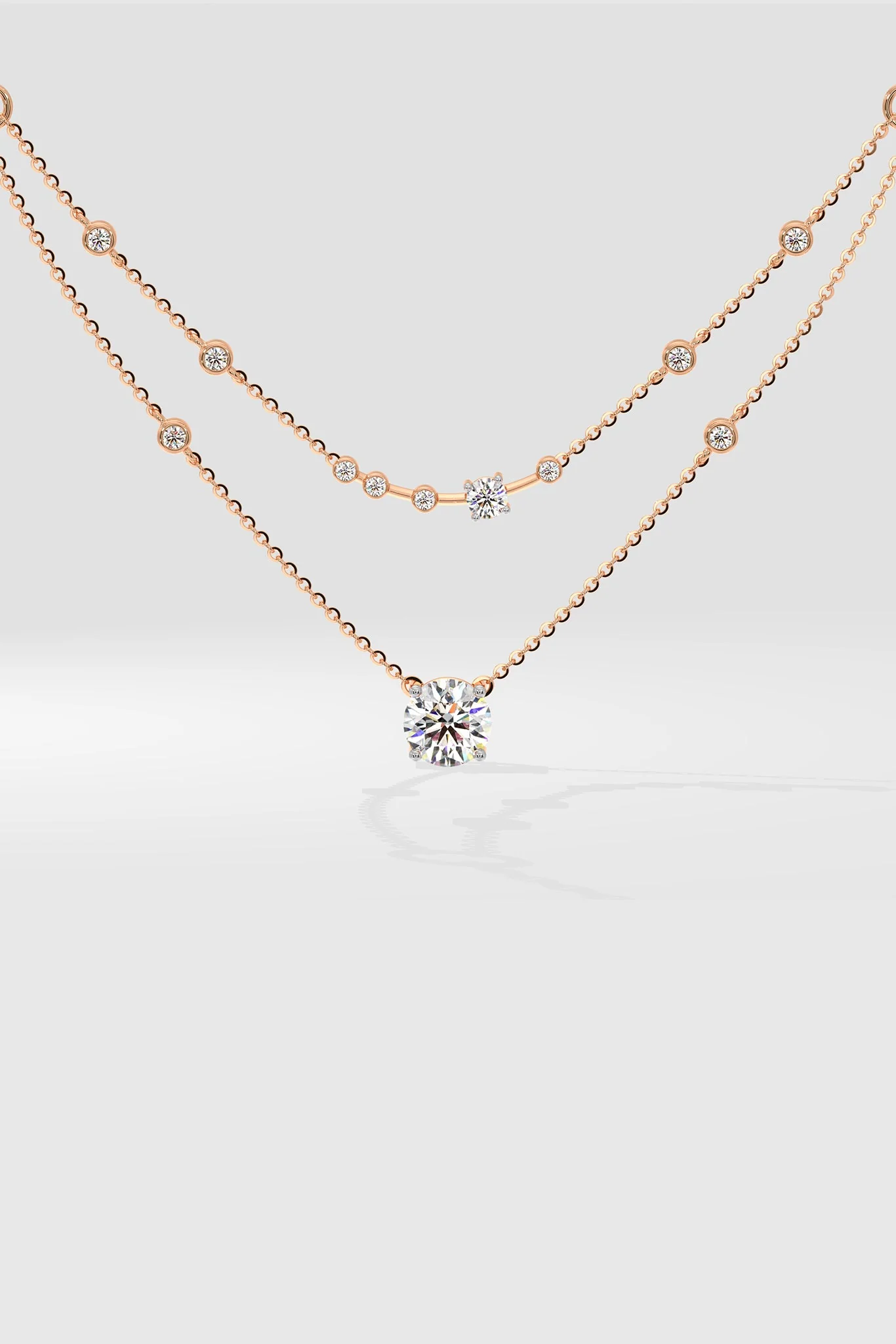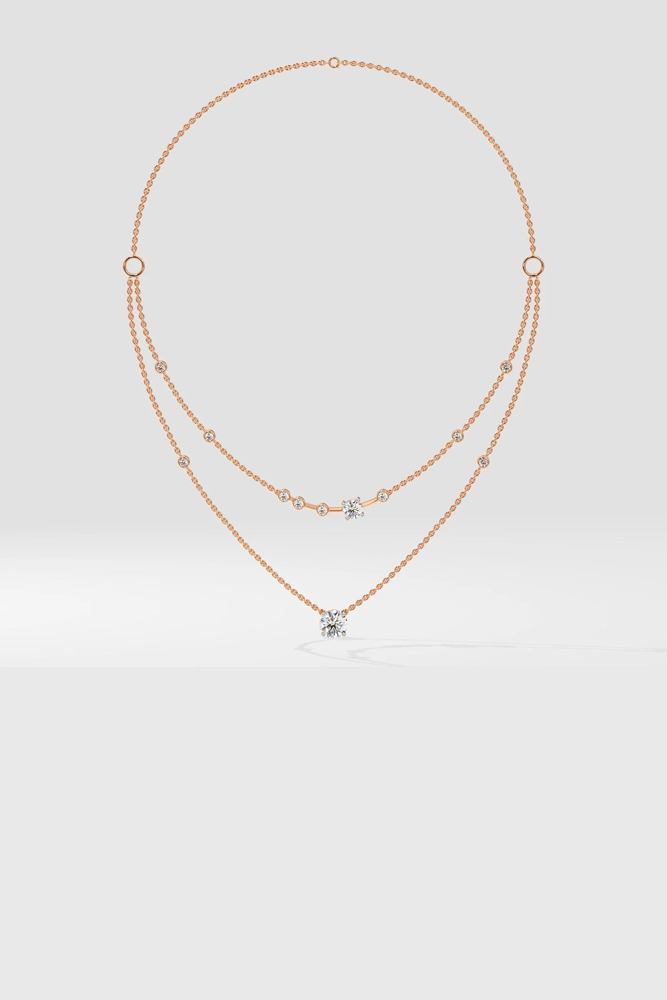 The Two Layered Necklace features a 1 ct solitaire pendant along with a smaller complimenting 1/4 ct stone. Works well for everyday and for a night out, this delicate necklace is perfect for gifting as well.