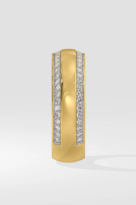 The classic two-row band features diamonds in channel setting on either side. The dome silhouette is on the outside and inside providing that comfort fit.